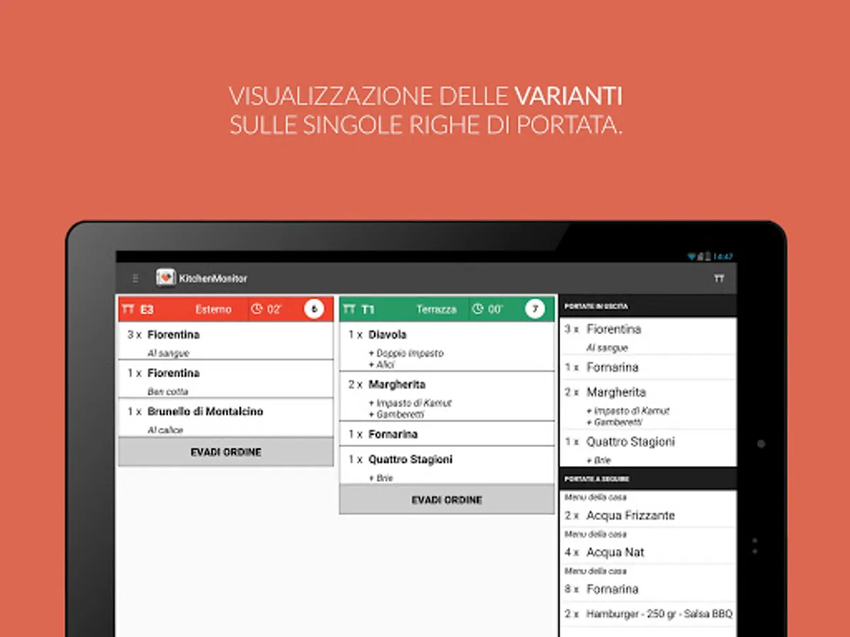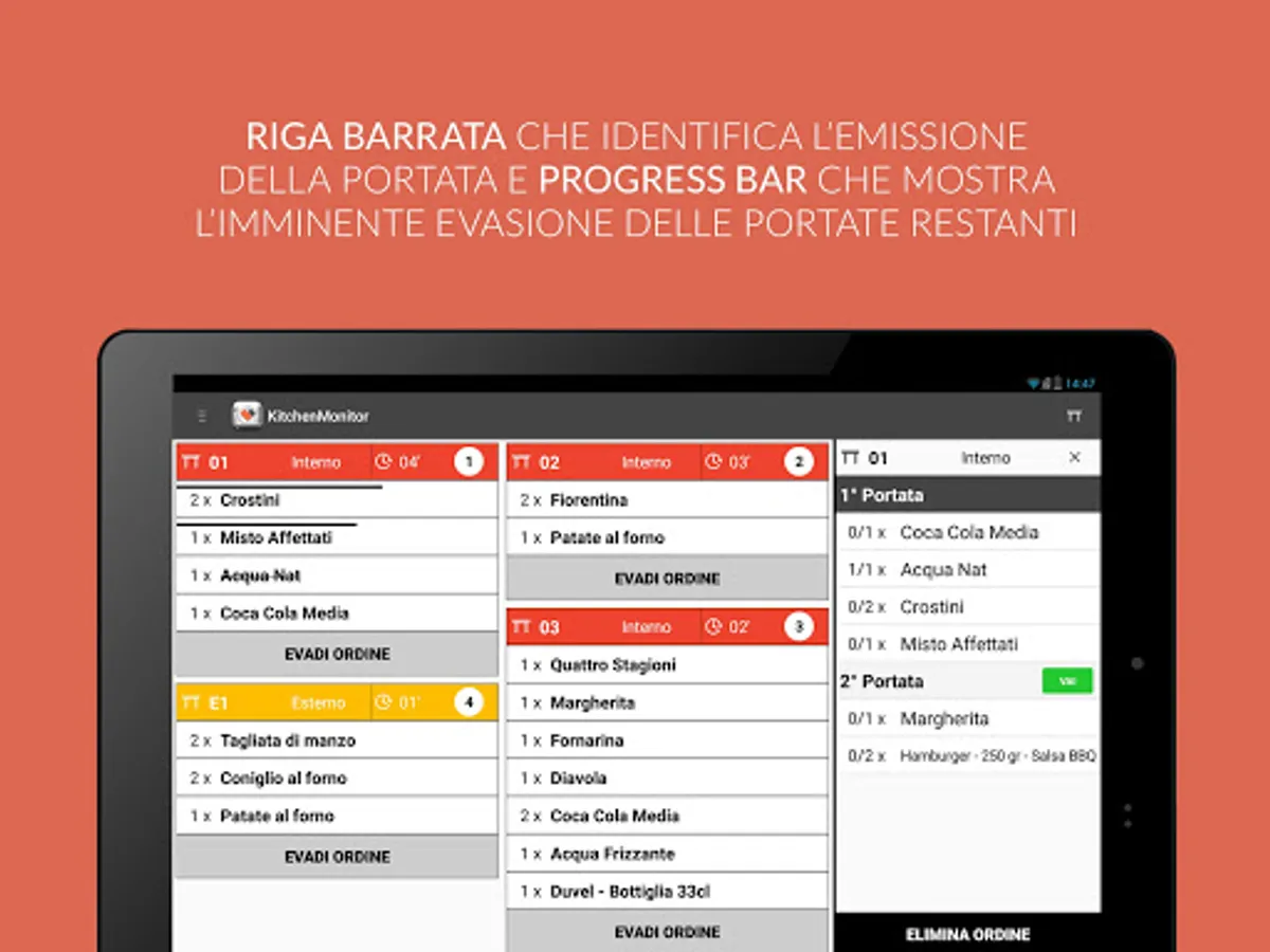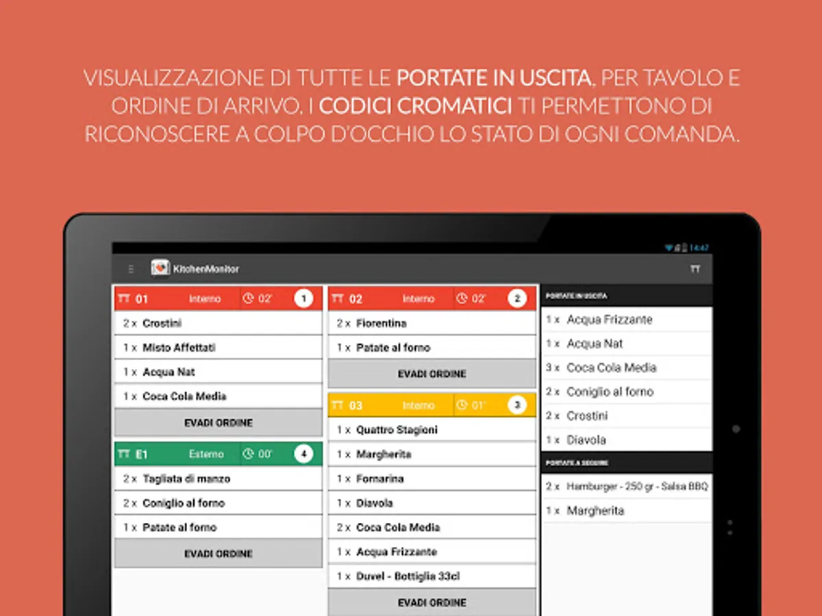 With Kitchen Monitor you can increase your staff's efficiency and improve table service! The order, managed by cash point or handheld, is sent to the production centers and shown in real time on convenient touchscreen monitors. The cooks know and manage the status of each order, reporting to the cash desk in the Cloud when it is ready to serve.