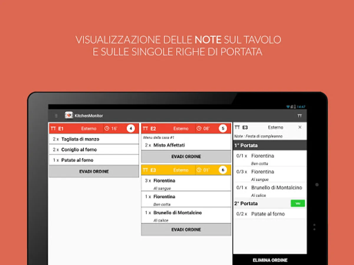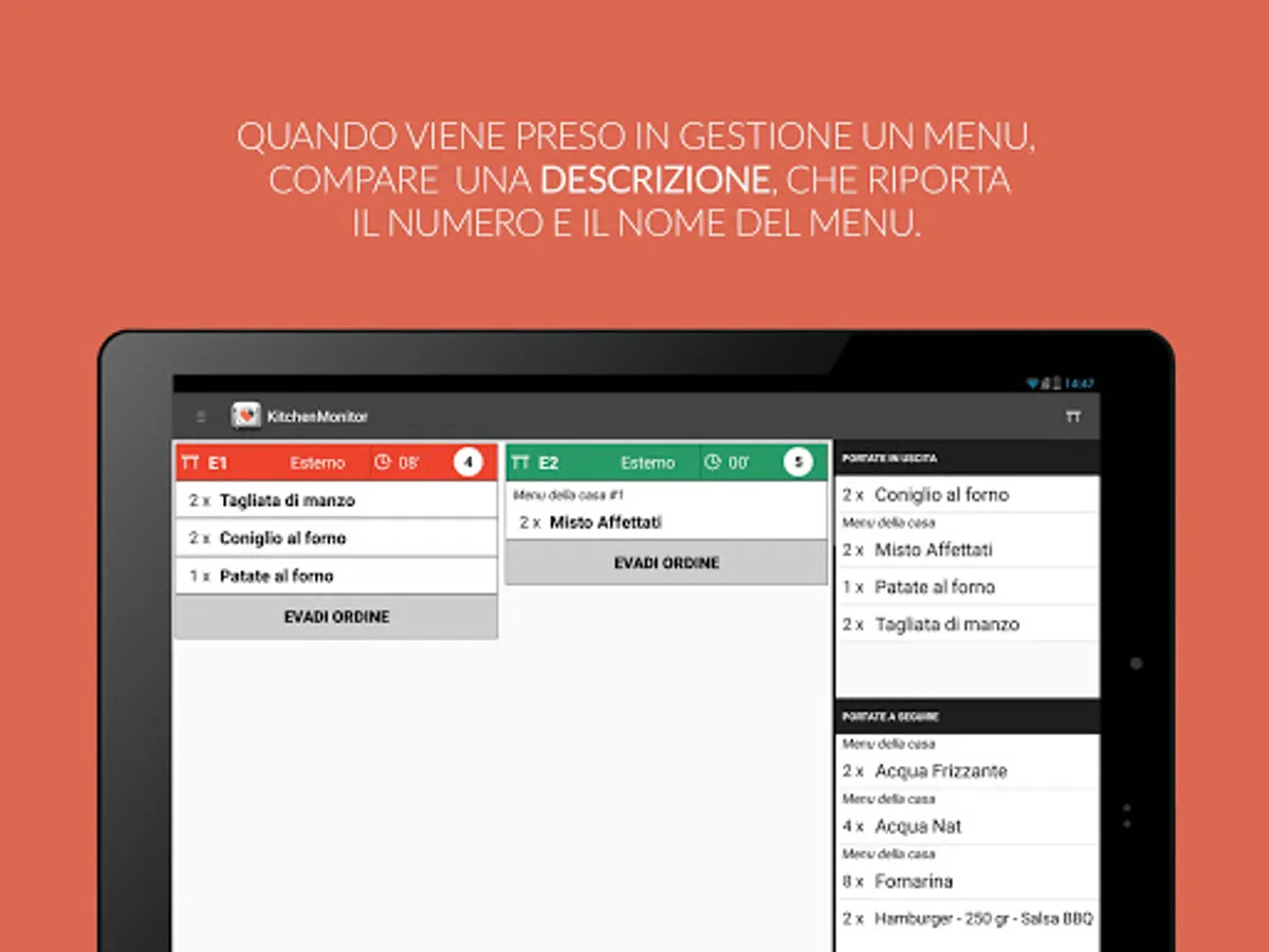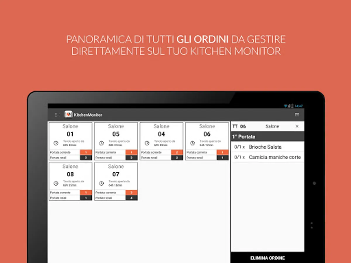 With Kitchen Monitor you can increase your staff's efficiency and improve table service! The order, managed by cash point or handheld, is sent to the production centers and shown in real time on convenient touchscreen monitors. The cooks know and manage the status of each order, reporting to the cash desk in the Cloud when it is ready to serve.