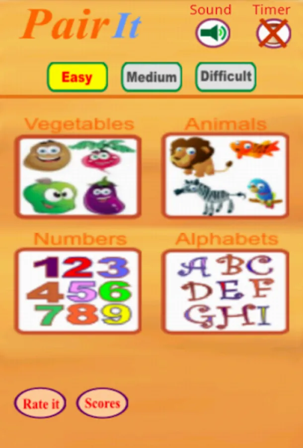 It can be played by pairing animals, vegetables, numbers or alphabets in easy, medium or difficult category. Depending upon number of moves taken to unhide all boxes, rating and stars are achieved and next target is given. It's a must have app for all growing kids in preschool and school.