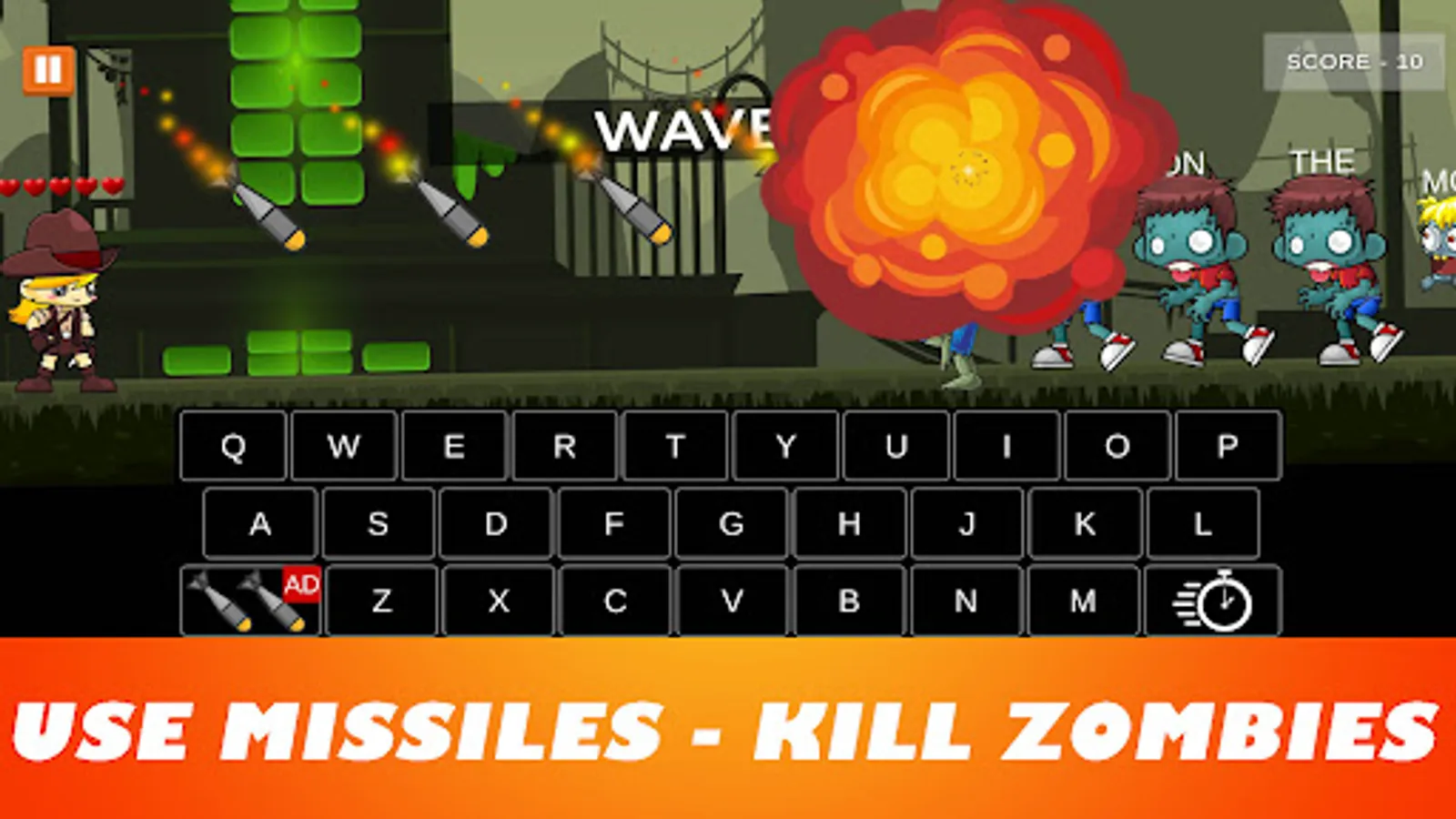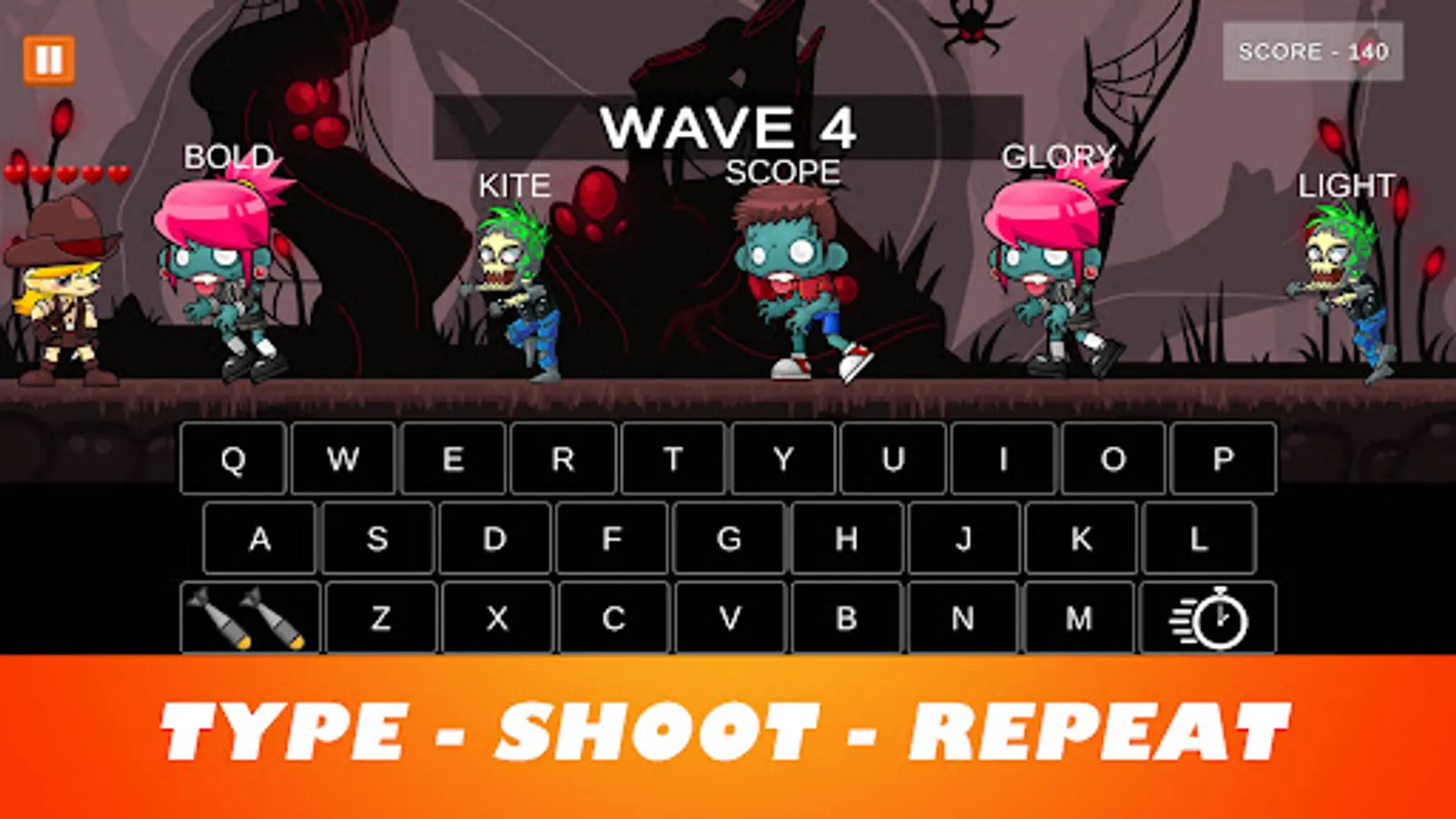 2) Word Mode – Zombies with random words will appear. Type and shoot them. Do Typing practice.