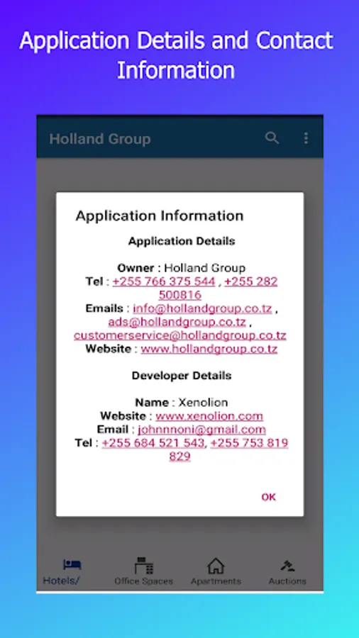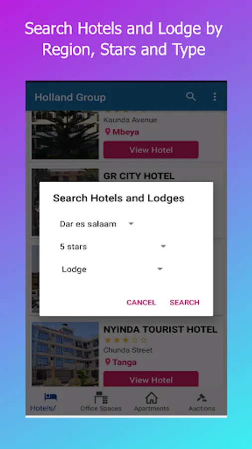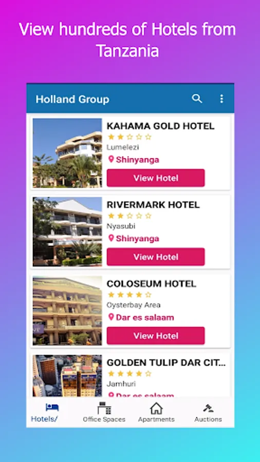 Holland Group TZ is an Application that gives you free access to the most affordable and secured Hotels in Tanzania. You can Explore Hotels and Lodges by