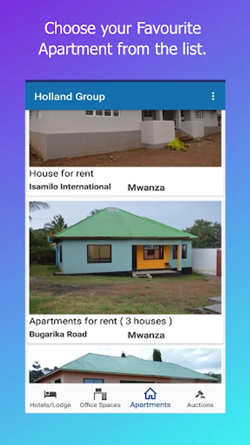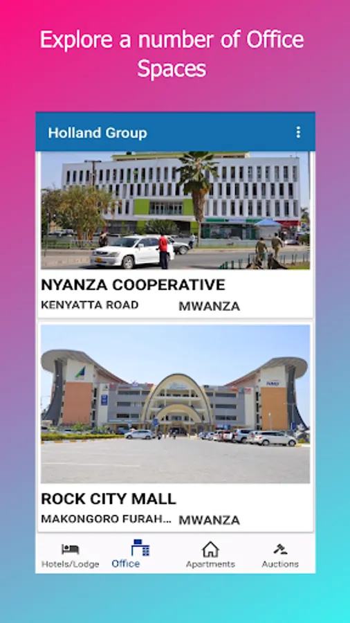 Holland Group also includes Office Spaces Available and Apartments you can book and View the details and Images of each, Rent Cost and Contact Information.