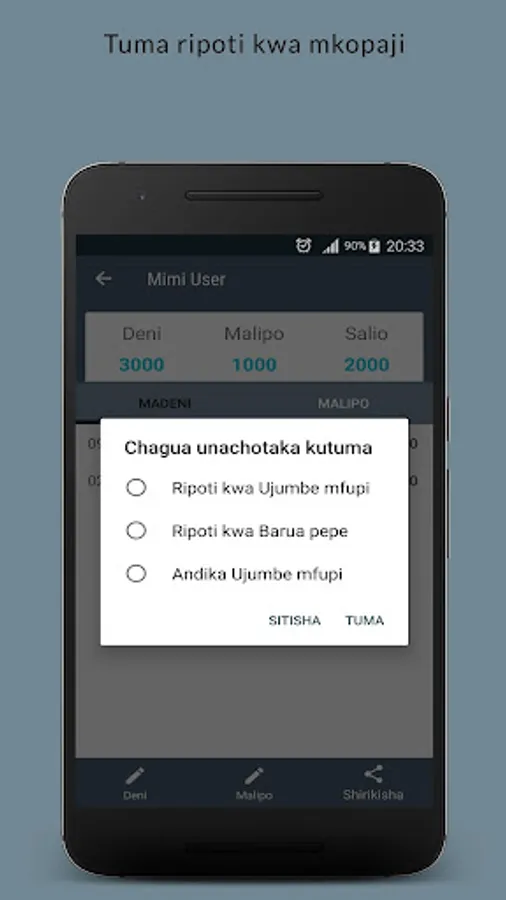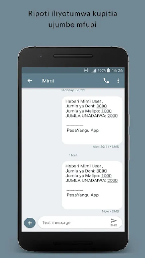 Kwa kutumia App hii unaweza mtumia mdaiwa wako ripoti fupi ikionyesha jumla ya madeni , malipo na salio lake kwa njia ya ujumbe mfupi(SMS) au barua pepe.