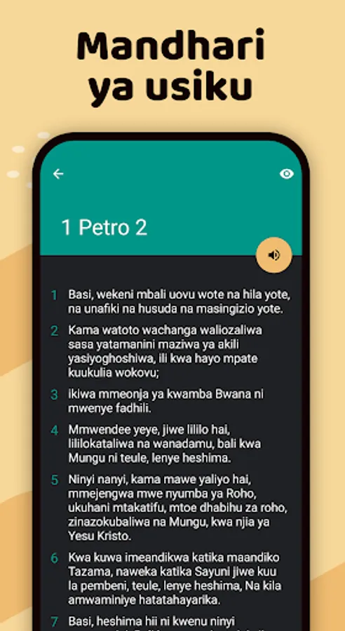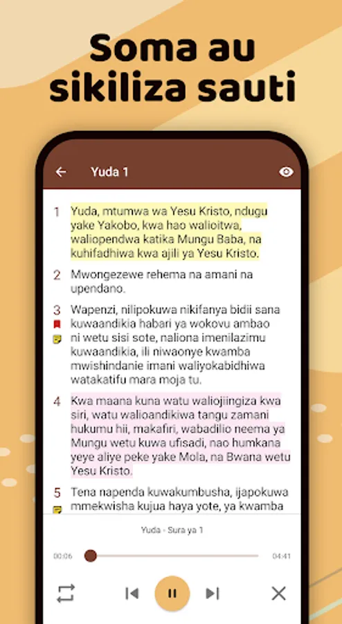 Swahili Bible app - Biblia Takatifu na Sauti enables you to read the Bible in Kiswahili offline without the need of internet connection.