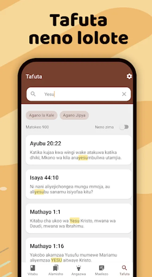 ★ Searching for any word or words in the Bibilia Takatifu, Swahili Bible or in the Old and New Testament.