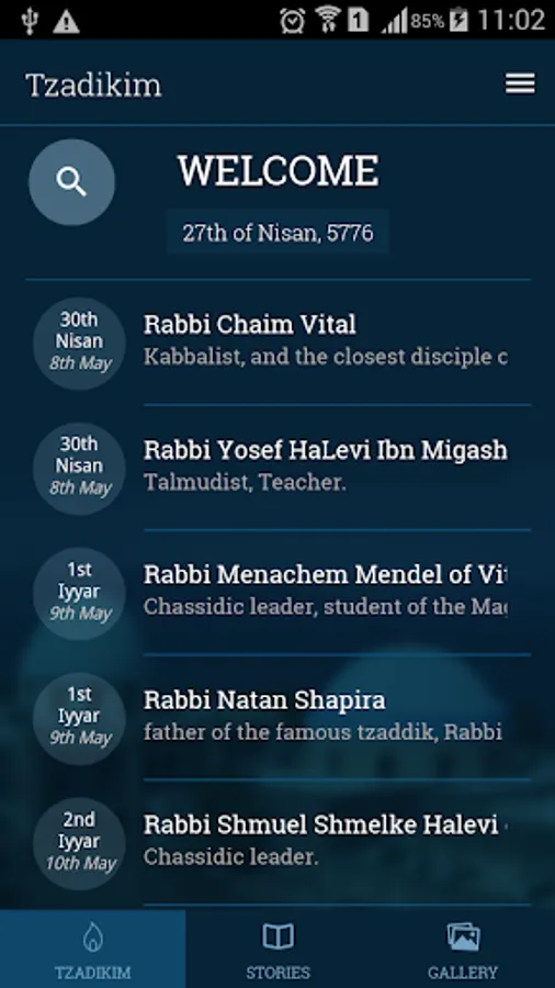 The picture in the background of the app’s opening screen is of the view of the Sea of Galili (Kineret), looking from the site of Rabbi Meir Baal Haness, ‘the owner and maker of miracles’. It was chosen with the consciousness of bringing miracles to those who pray and study our great Tzadikim.