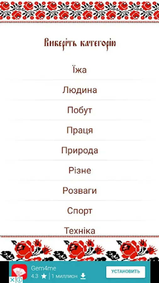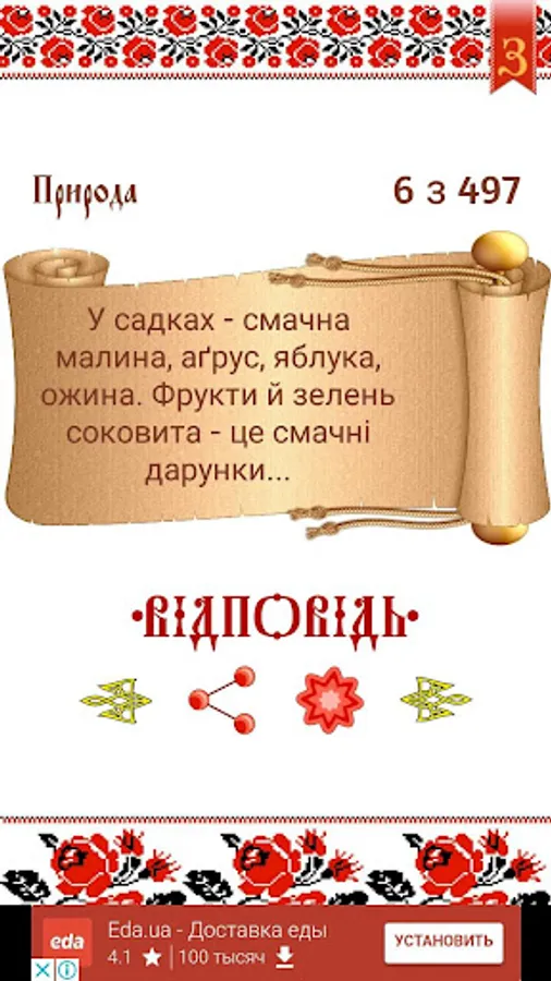 The application contains over 1,000 puzzles of Ukrainian vidpovidmy, grouped into 10 categories: food, man, life, work, Nature, Other, Entertainment, Sports, Transportation and School.