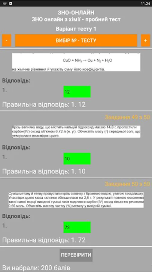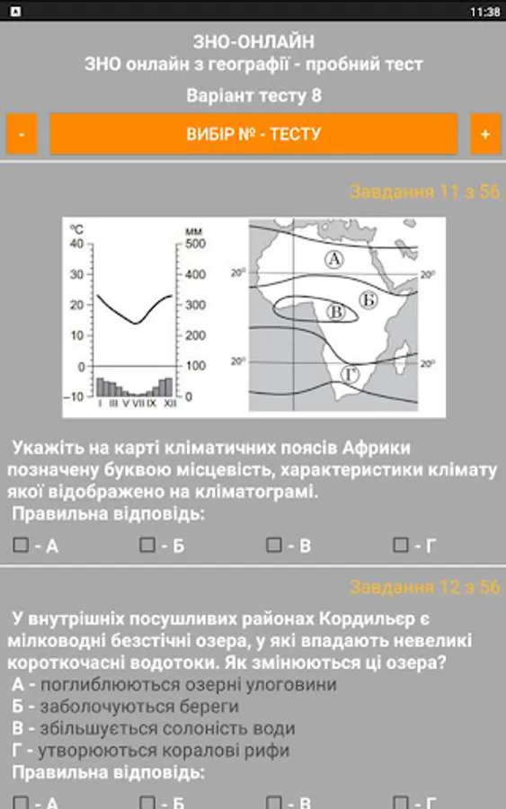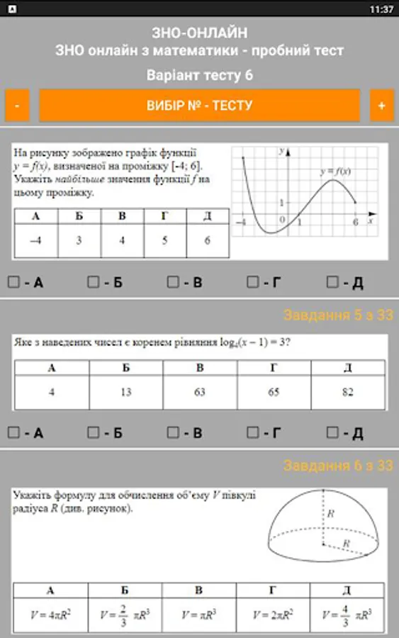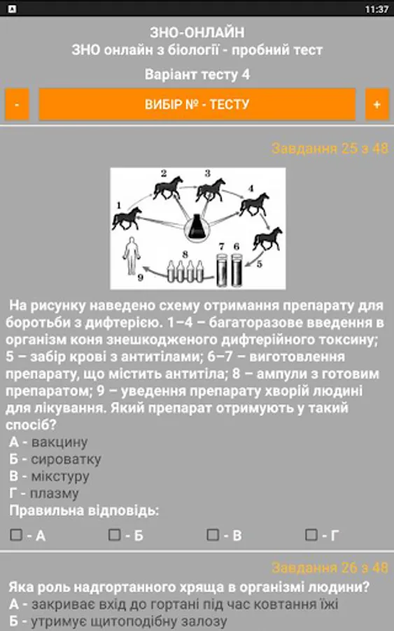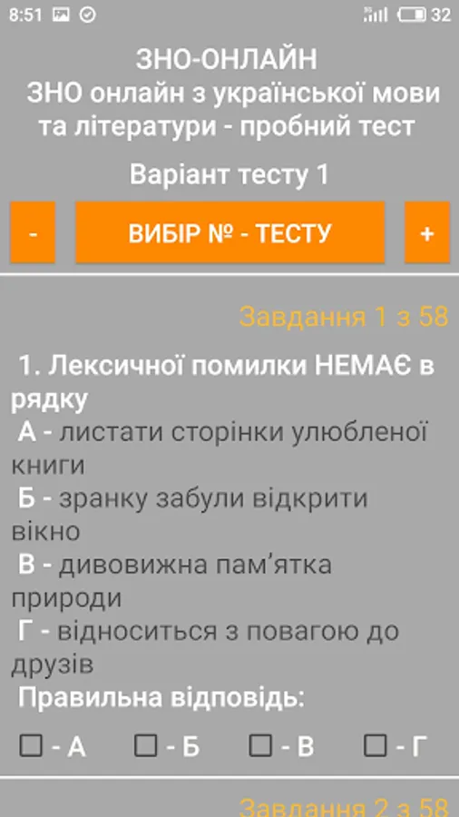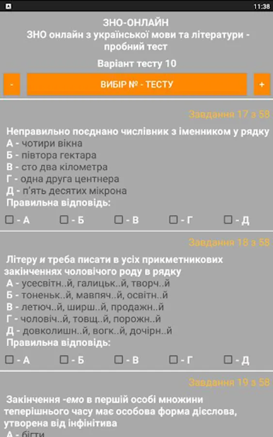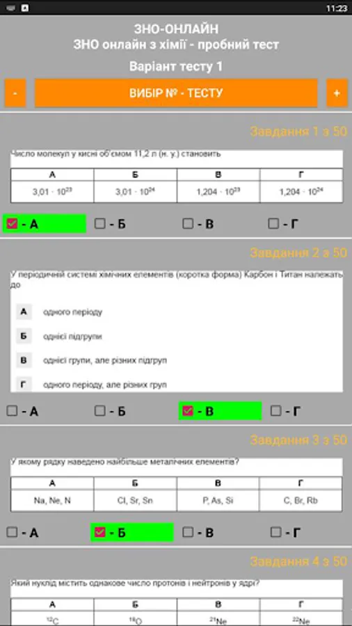 The ZNO-Tests program gives students the opportunity to undergo test testing, which enables them to test their level of knowledge. The way to perform all the test tasks in the proposed tests is as close as possible to the real tests. The program offers the possibility of passing the test and checking for errors when the wrong answer is given (the wrong answer is highlighted in red), as well as the result of the total number of correct answers (the correct answer is highlighted in green).