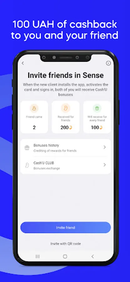 • Referral program “Invite a friend” — invite your friends to download Sense SuperApp and receive UAH 100 of cashback each to your accounts if a friend is a new client of the bank