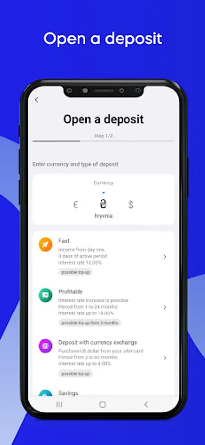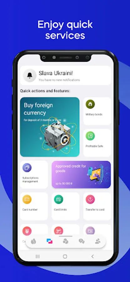 • Deposits: "Quick" — income for each day, “Profitable” with the bonus for prolongation, "Saving" for any period you wish, deposit with currency exchange — to purchase US dollars from the UAH card with the obligatory deposit
