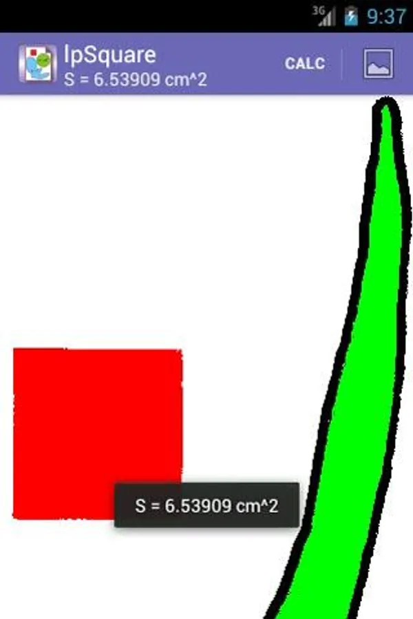 After pressing the «CALC», at the top of the screen will reveal value of the area selected figure. To deselect etalon or figure we need to re-do a long tap on the etalon or inside the figure.
