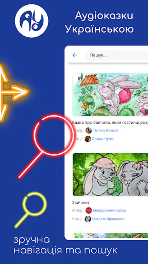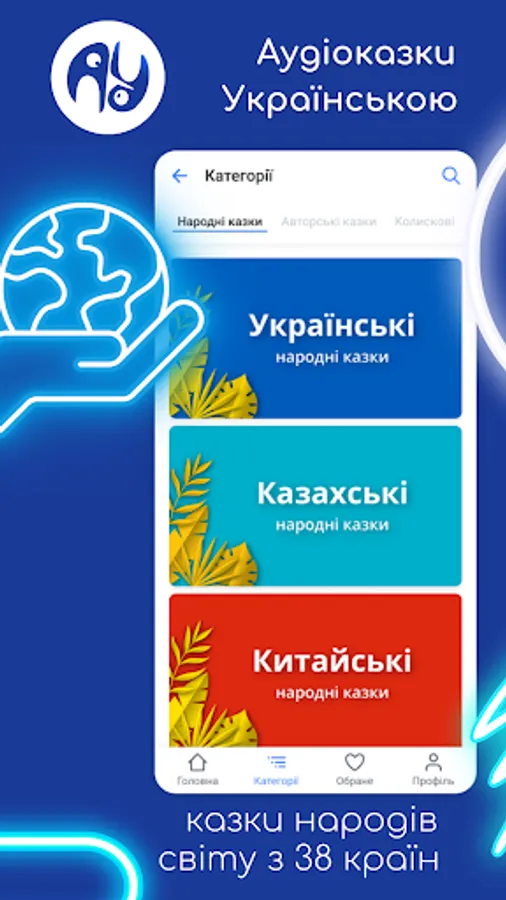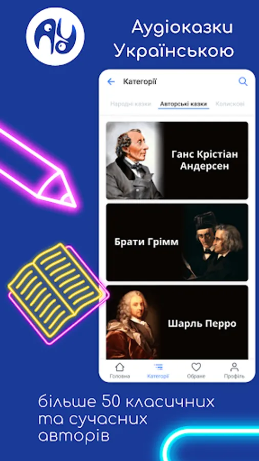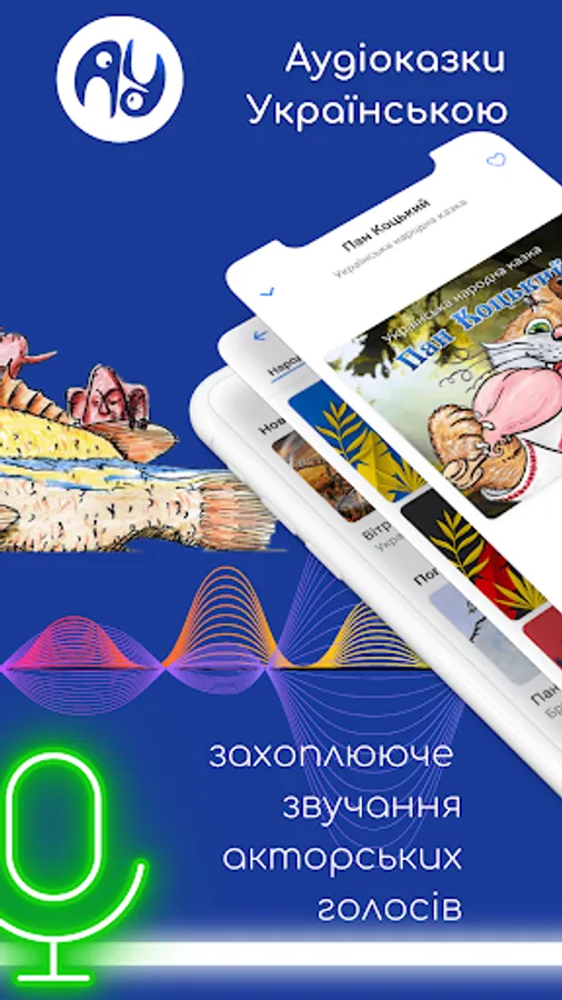 By subscribing to the application, you will open a whole world of the best folk and author's audio fairy tales for children in the Ukrainian language for your child. More than 50 professional announcers and voice actors work in our team, who make every effort to ensure that your child likes each fairy tale.