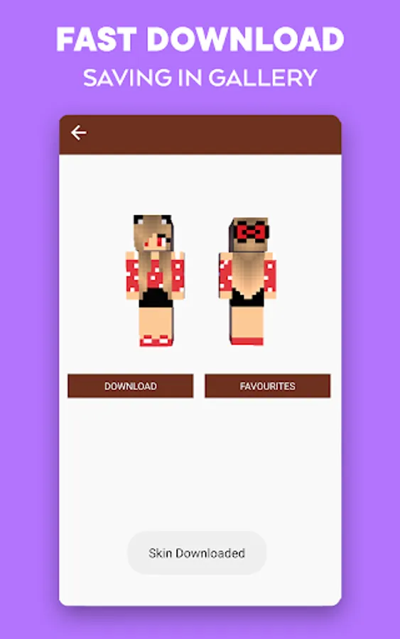This app offers more than 1000 ++ stylish cartoon skins. You can find the following categories of skins: hot skins, horror, in glasses, hackers, skeletons, noobs, lucky blocky skins, griefers, with white eyes, camouflage, 4D skins, top youtubers, gravity falls, spider man, Ben 10, popular skins, with raincoats, superheroes, military.