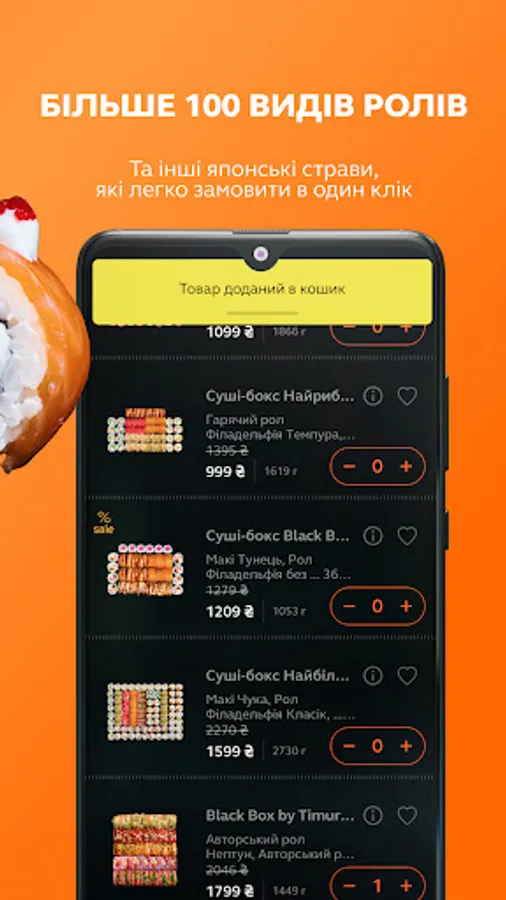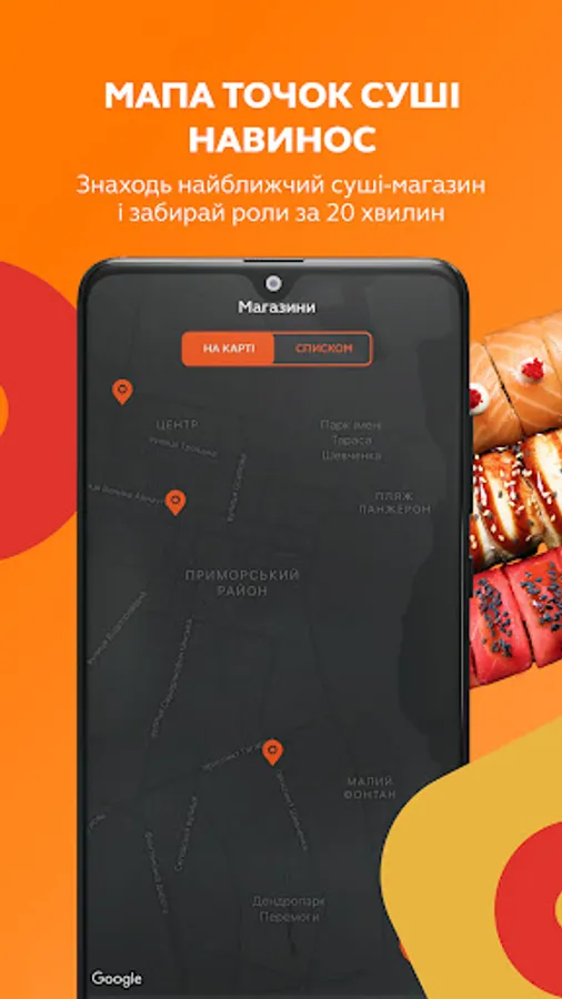 The chain of BuduSushi brand stores makes it possible to order sushi in Odessa, Kiev, Nikolaev, Chornomorsk, Gostomel and Vasilkov in just a few clicks. In the application, you can select your city, familiarize yourself with the nearest locations of sushi stores, view their opening hours. Perhaps it is right next to you that there is a round-the-clock sushi pick-up point!