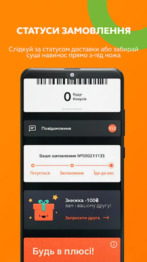 Click on the “Invite a friend” picture and send the link to the biggest Japanese food lovers. Any messenger can be used. As a gift, you and your friends will receive 100 UAH discounts. To get a discount, you need to make an order within 7 days in the amount of 250 UAH after a friend makes his order.