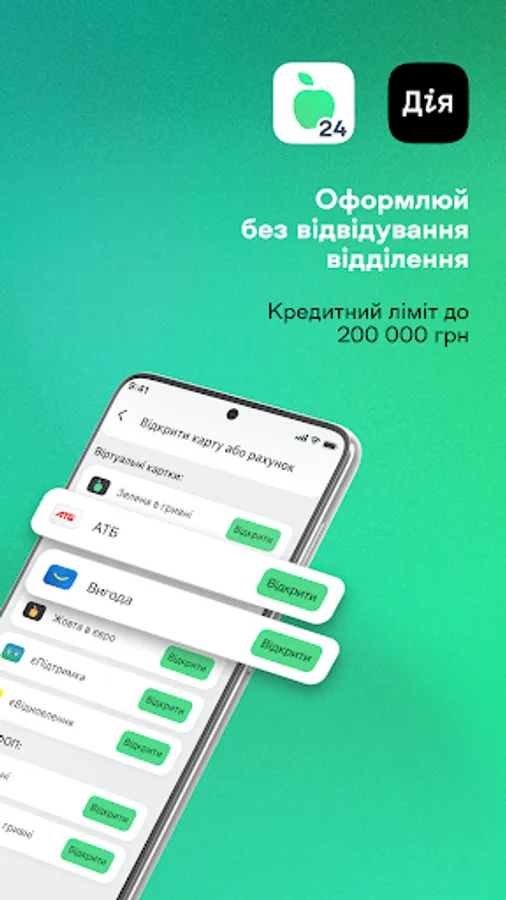 5 хвилин і картка Ваша! Замовляйте найкращу картку «Зелена» з кредитним лімітом до 200 000 грн і пільговим періодом до 62 днів вже сьогодні, без відвідування відділень та черг: