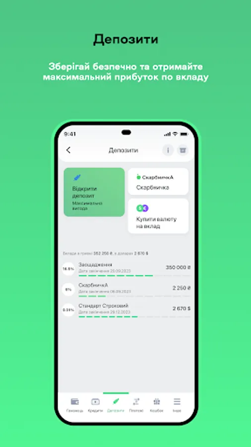 • Просте відкриття депозитів в гривні, доларах США та євро