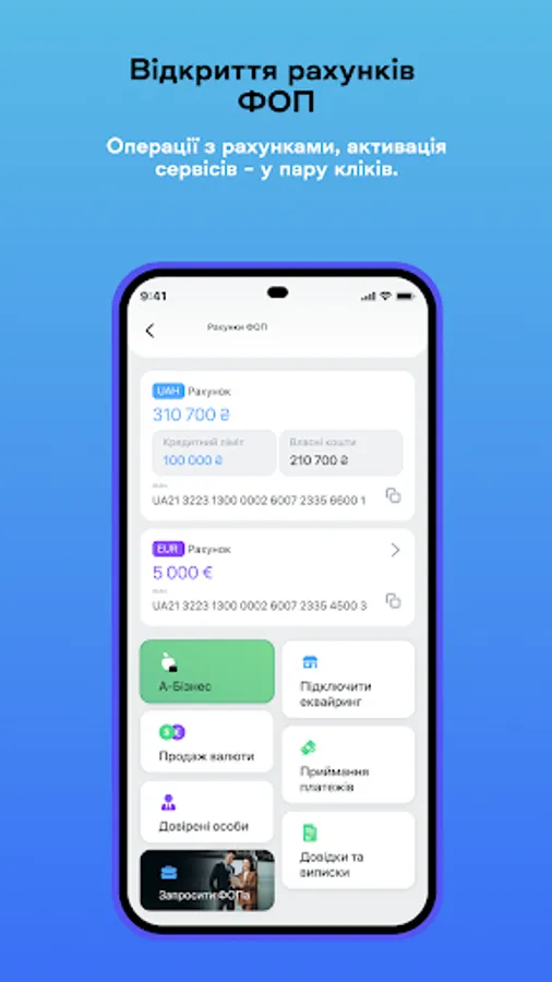 Відкривайте рахунок ФОП прямо в додатку. Два кліки в смартфоні — і рахунок в А-Банку відкрито. Автоматично надається віртуальна картка підприємця для швидкого доступу до коштів на рахунку.