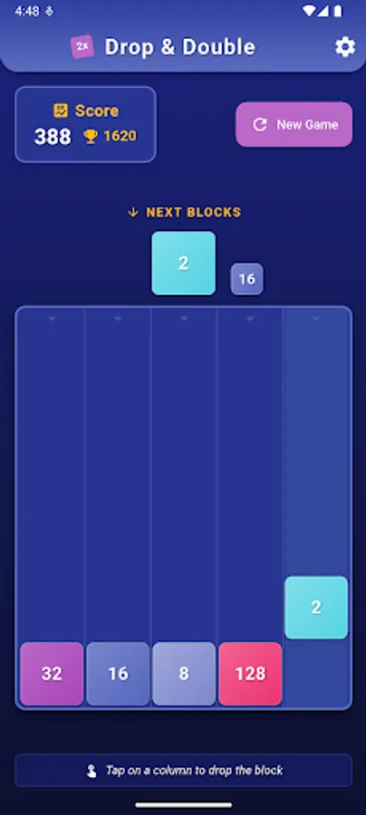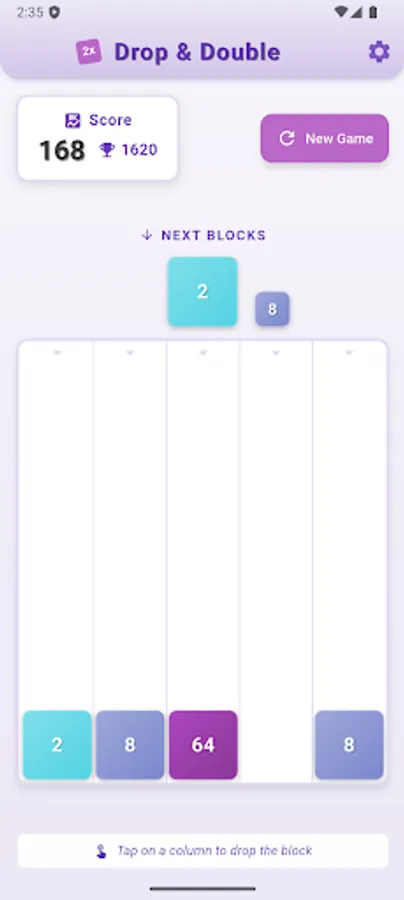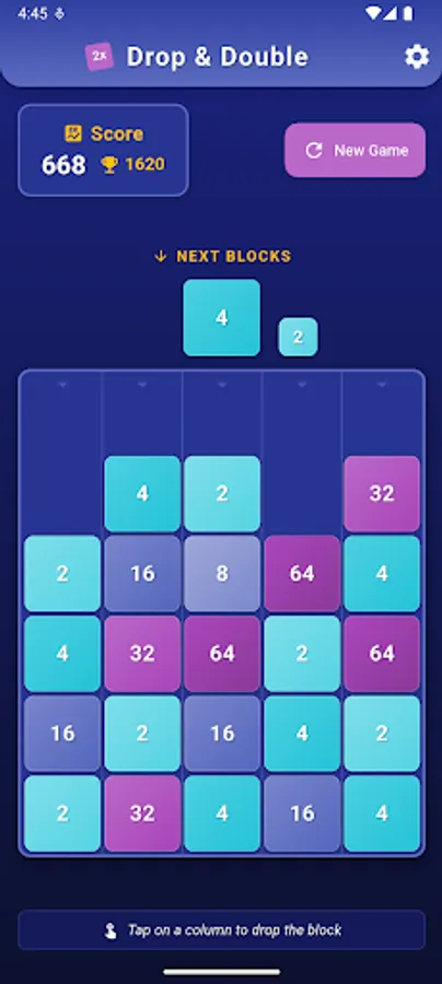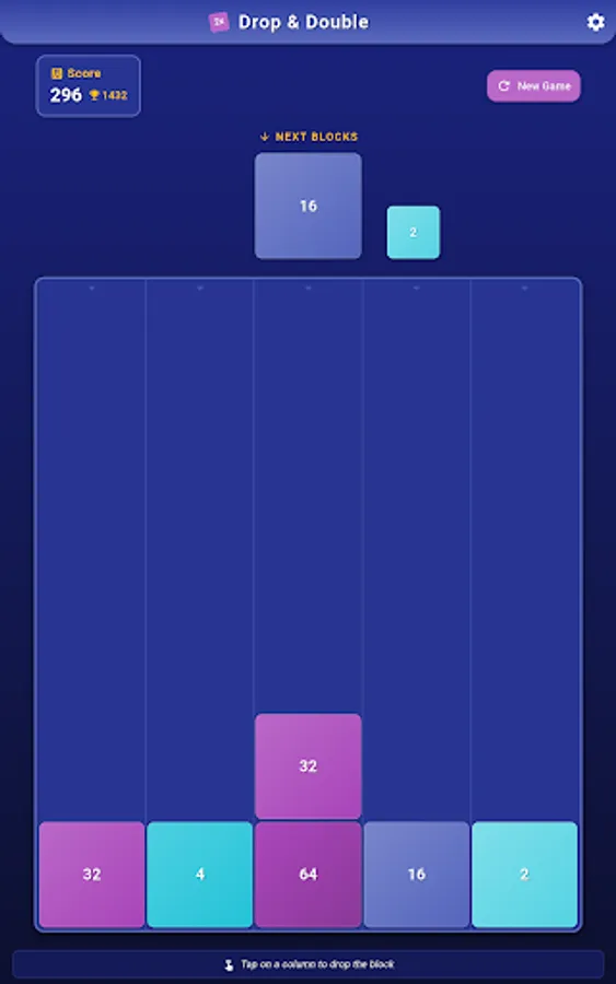 Enjoy this fun number-merging puzzle game with simple one-touch controls! Drop numbered blocks into a 5x6 grid and watch as matching numbers merge and double in value.