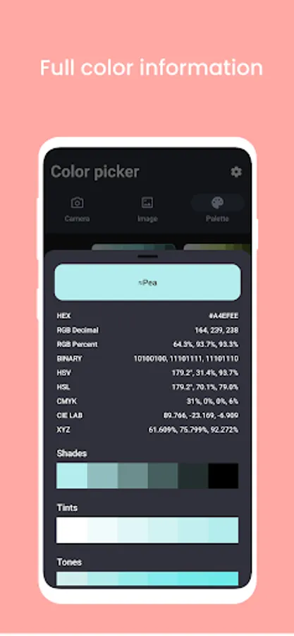 But that's not all! Our app also provides comprehensive information about each color you capture. You can view detailed color information such as complementary colors, shades, tints, tones, tetradic colors, triadic colors, analogous colors, and monochromatic colors associated with your selected color. This feature gives you a deeper understanding of the color's relationships and opens up a world of possibilities for your design projects.