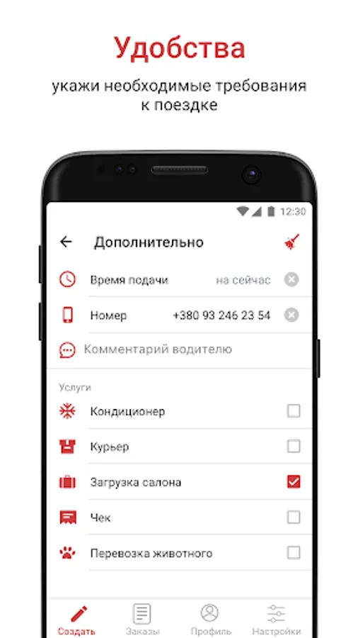 - the ability to choose additional services: air conditioning, courier, luggage, pet