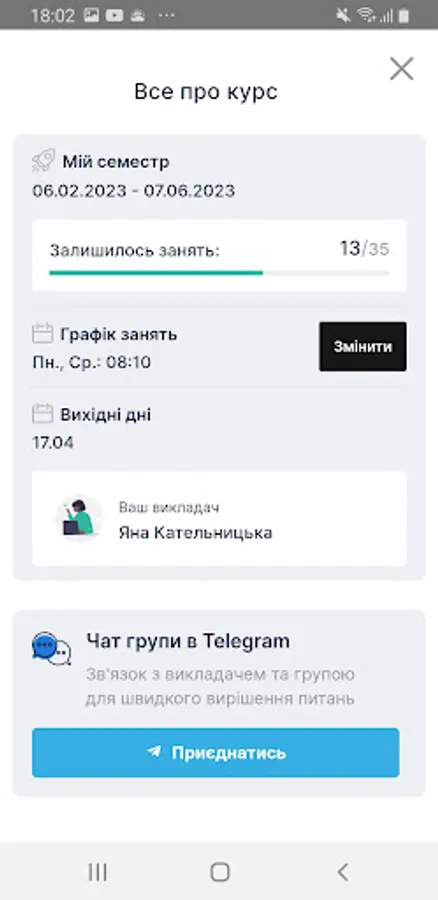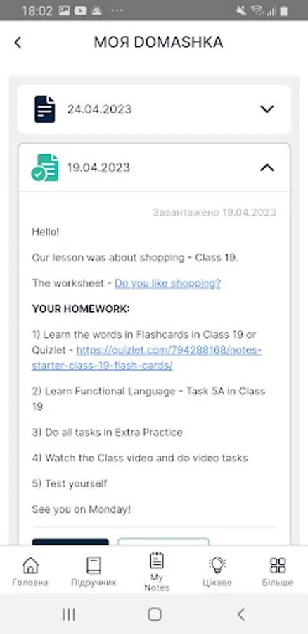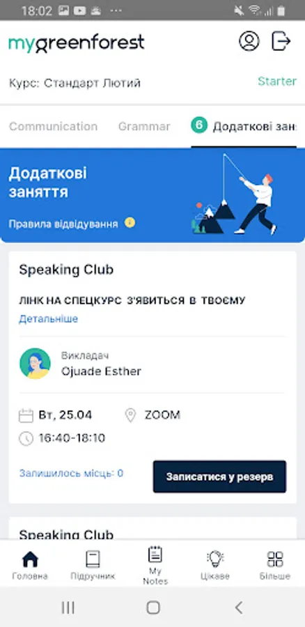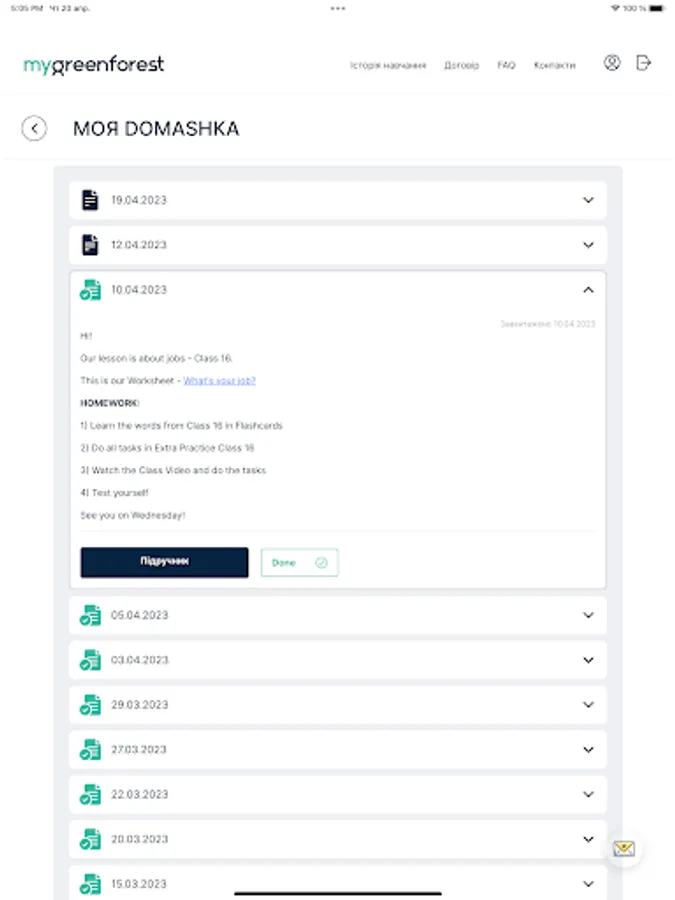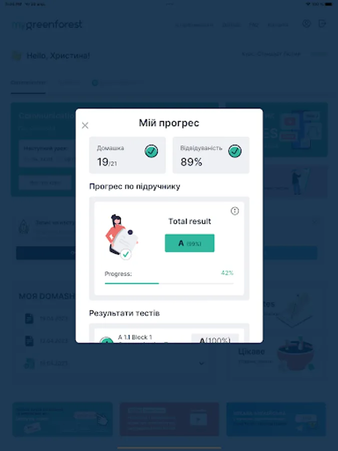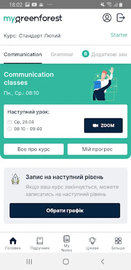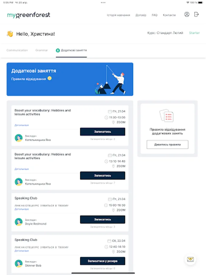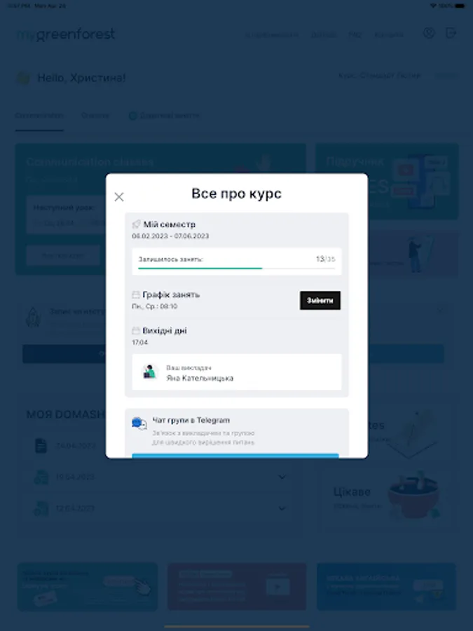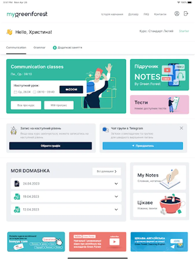 Application for students English School Green Forest. Access to the decomposition of homework, write additional courses, courses, clubs, Skype lessons.