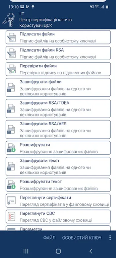- Access certificates CSK, servers, CSC, other users certificates and CRL (Certificate viewing and SOS of file storage, search for certificates in the file repository and using the protocol the OCSP, certificate status determination by SOS and the protocol the OCSP, checking the validity and integrity of the certificates and etc.);
