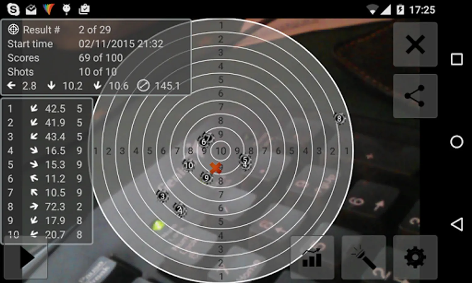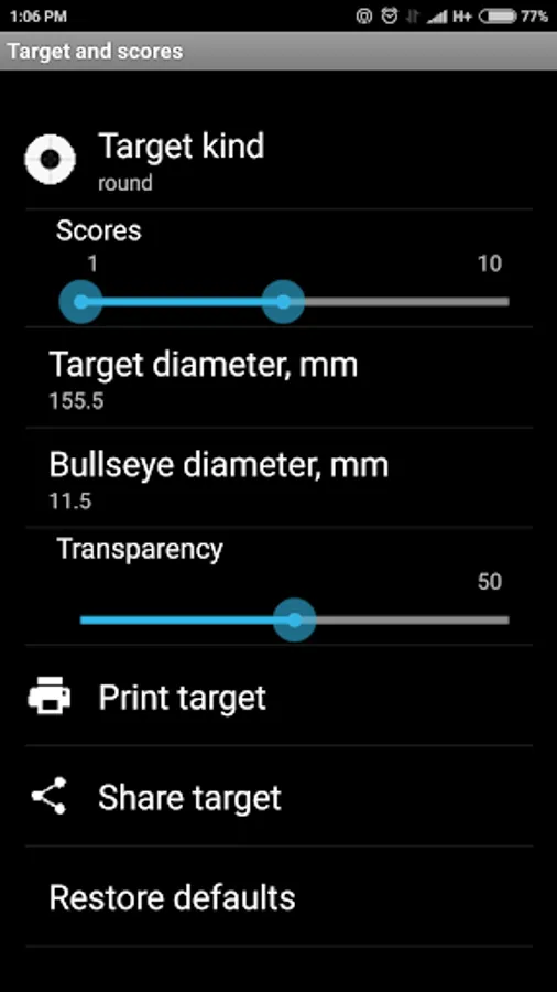 - Universal round target included: Set a diameter, the minimum and maximum number of scores, the diameter of “a bulls'eye”, the diameter of the shots (caliber).