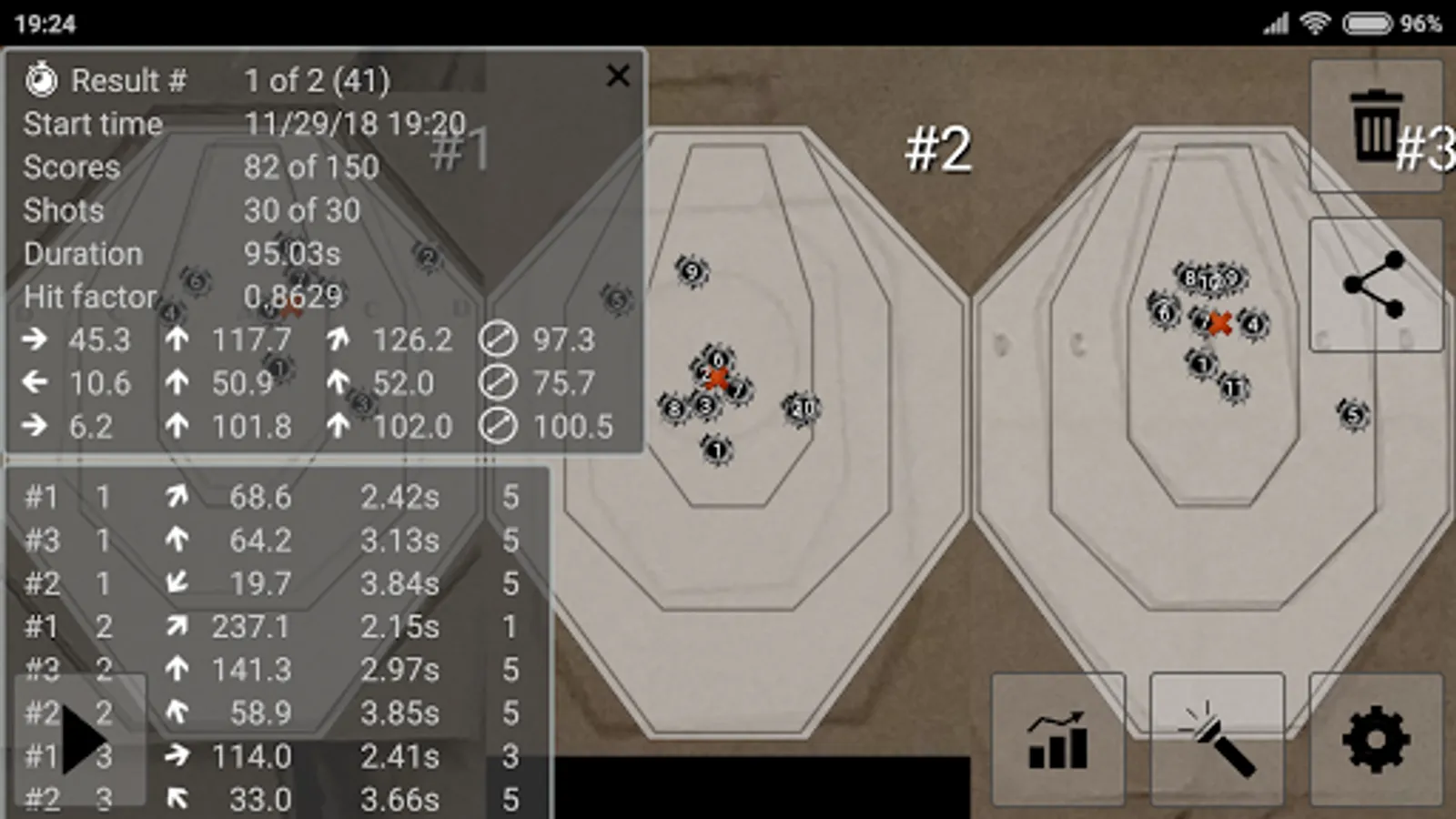 - Statistics of a drill: result on points, hit factor, table of shots, hitting the POI (point of impact) (horizontally and vertically deviation, the maximum diameter).