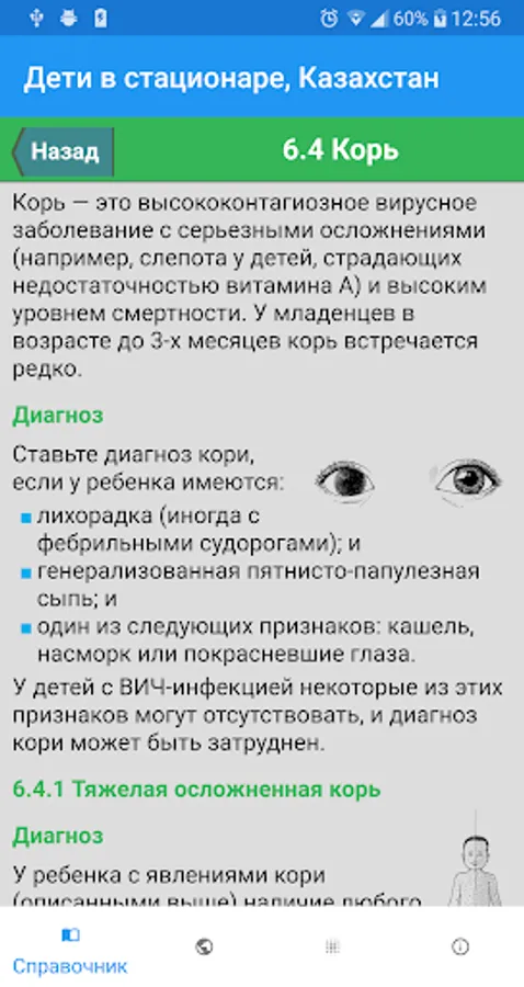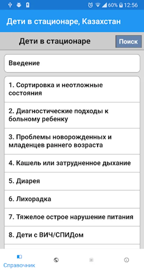 The electronic application contains recommendations on the stages of managing sick children in the hospital: emergency screening assessment, methods of examining children, laboratory tests, supportive care and monitoring, discharge and follow-up.