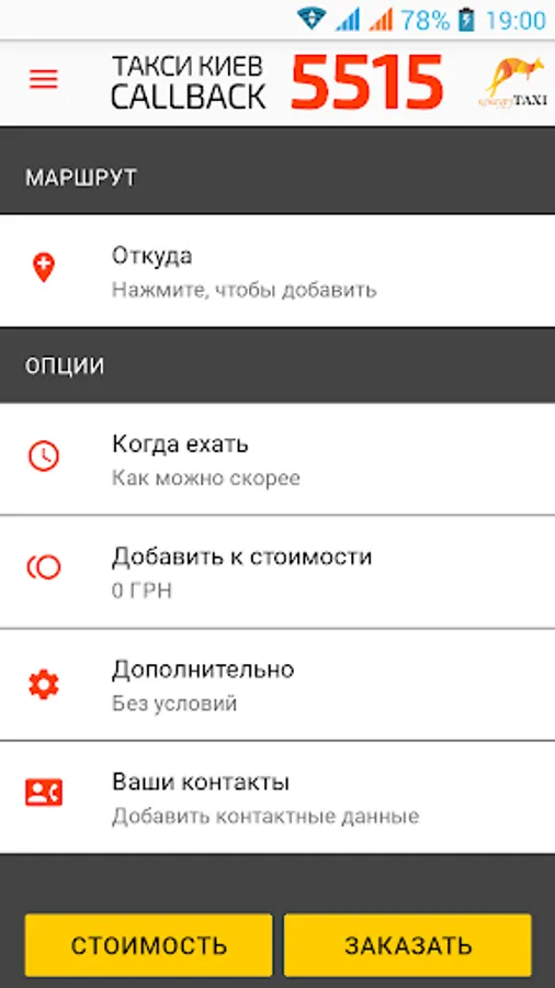 The application for calling a taxi Kangaroo 5515 - the best for ordering a taxi online in Kiev. Starting from the second order, your smartphone will have a very fast application in which you can order a car in 30 seconds. And if you repeat your previous route (one of the previous ones marked with an asterisk, then in 5 seconds). If you do not believe it, download our low-cost Kenguru taxi 5515 application and make an order.