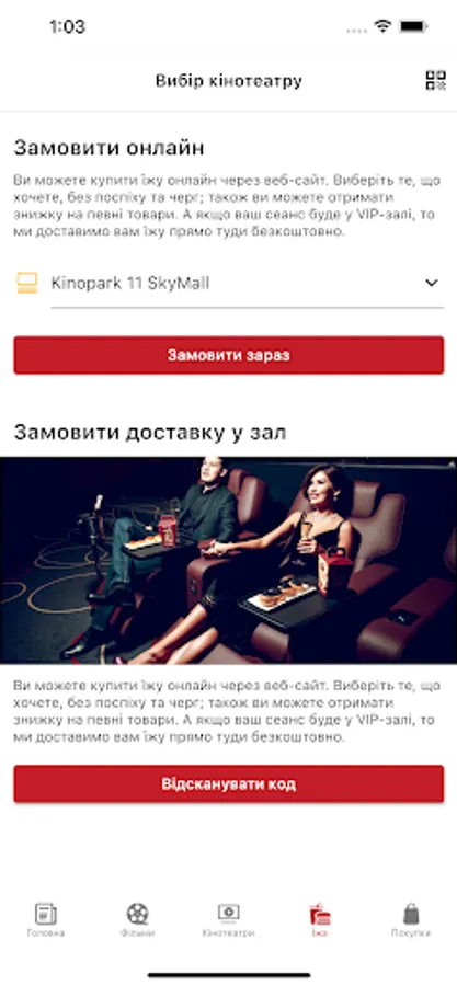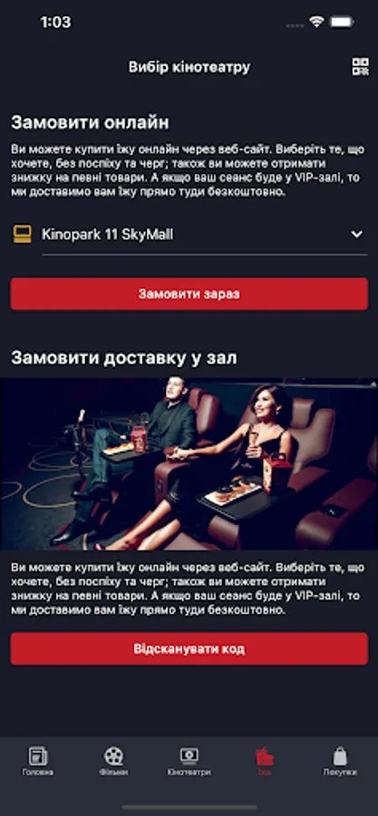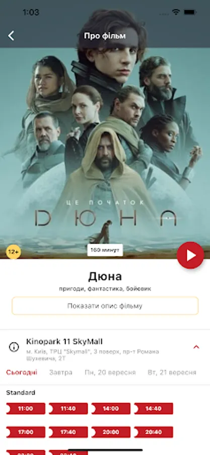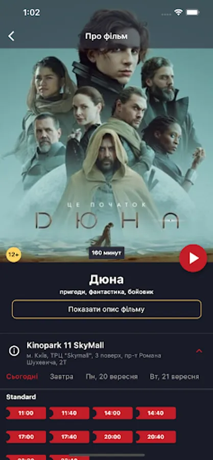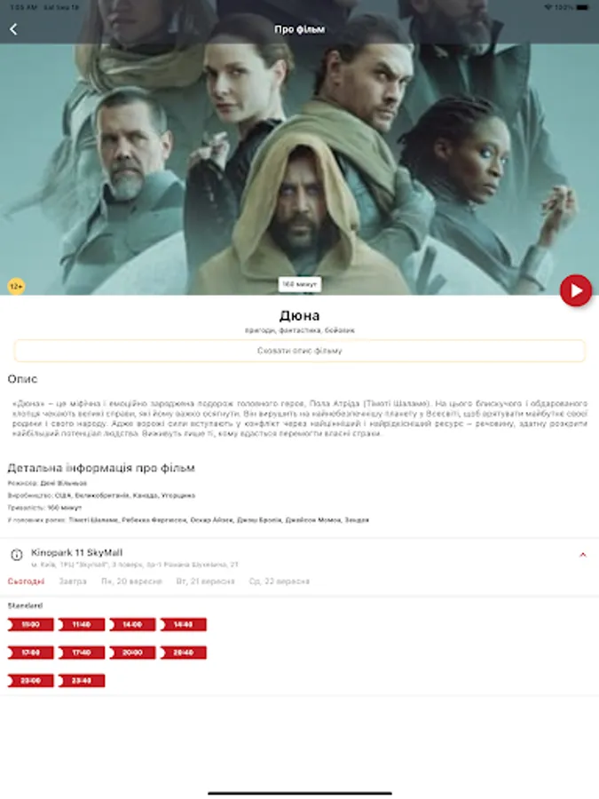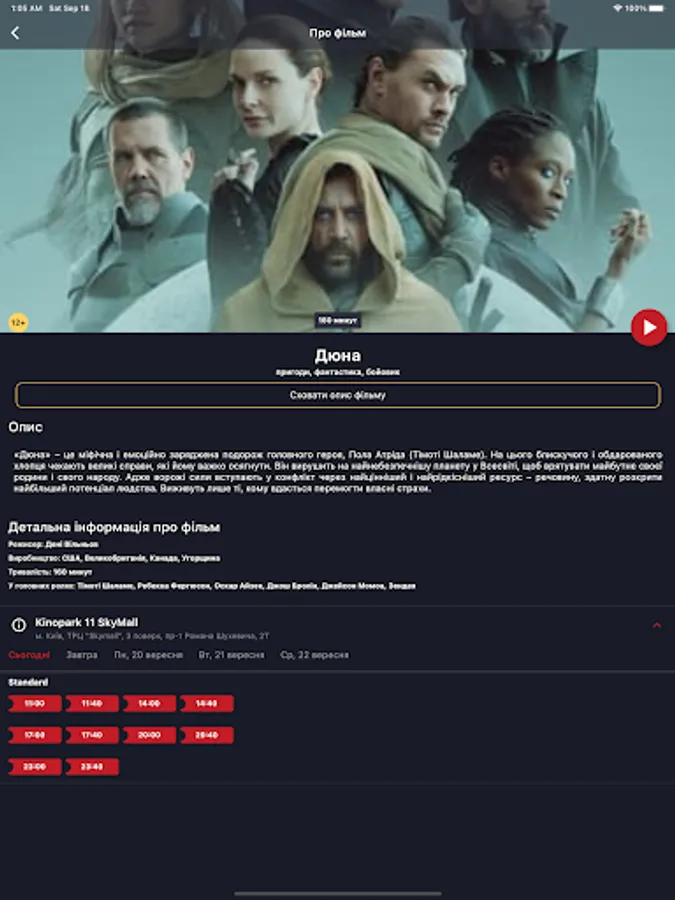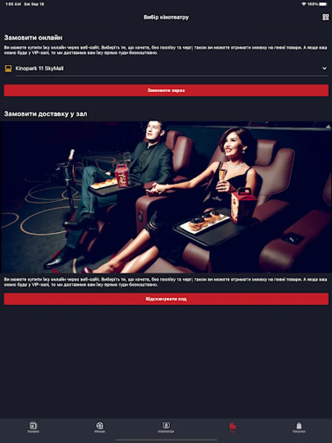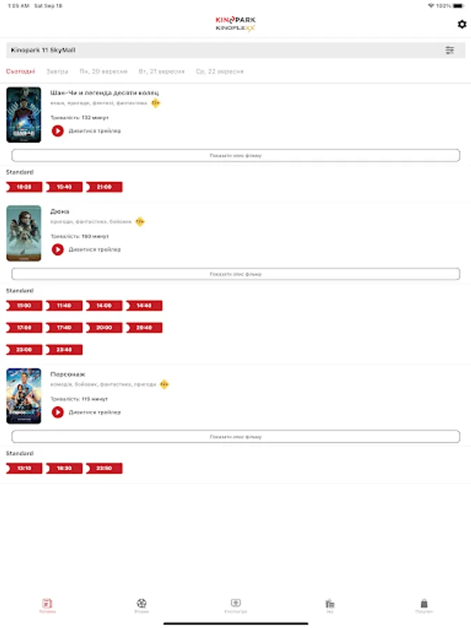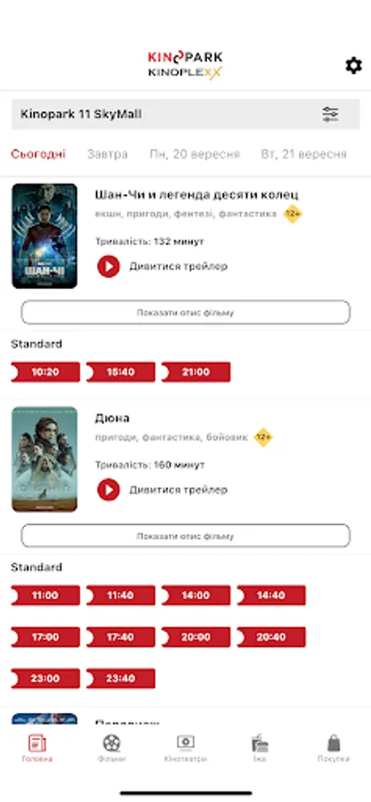 С помощью данного приложения можно узнать что идет в кинотеатрах сети Kinopark, просмотреть информацию о фильмах, выбрать удобный сеанс и купить билет.