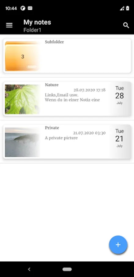 The notes app supports folders and subfolders. First you can add the main folders (Categories) and once you open a folder you can ad a subfolder or write a note with foto (optional) in this folder.