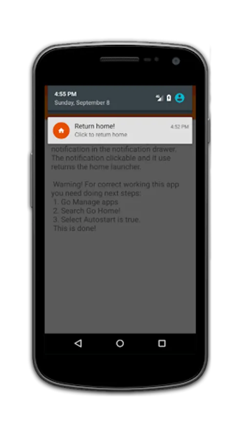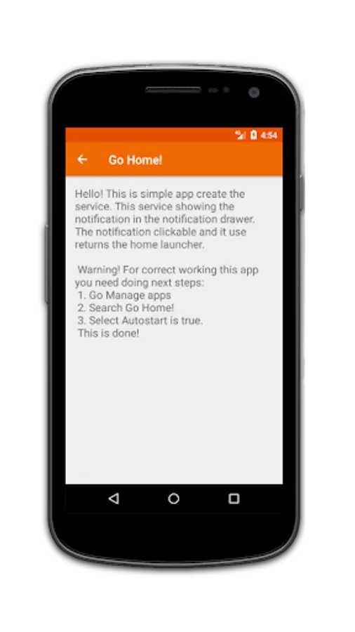 This is simple app create the service. This service showing the notification in the notification drawer. The notification clickable and it use returns the home launcher.