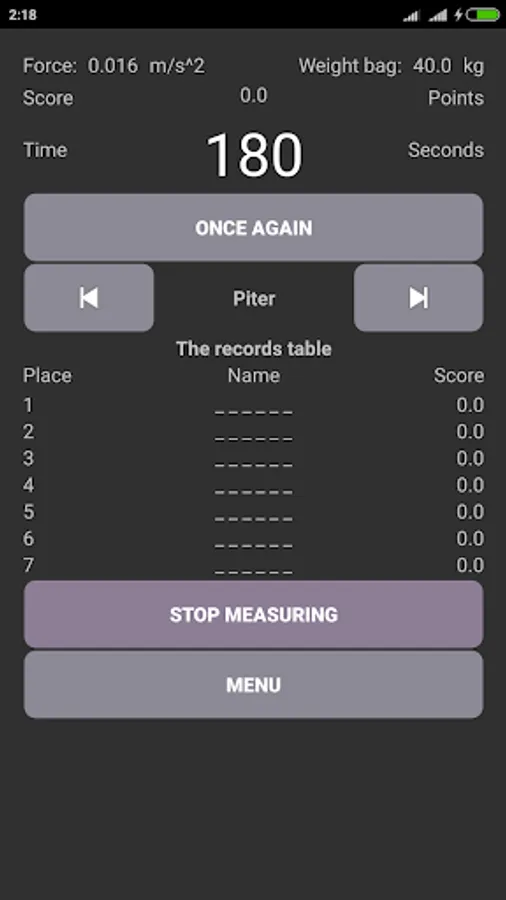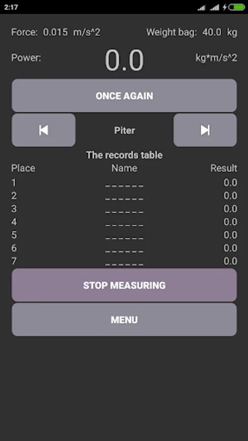Enter the weight of punching bag, to which you have attached the smartphone. Appendix multiply acceleration on weight and you will learn the force of impact. The app will save your seven best records. Keep in mind that the results depend on the properties of a punching bag (softness, stiffness attachment). With this application you can get accurate relative results, if they are carried out on the same sports equipment.