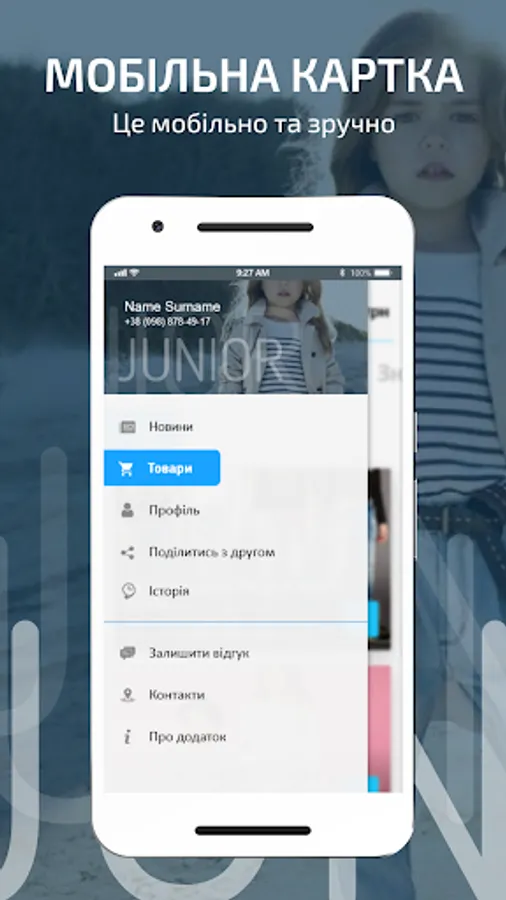 Loyalty program for clients "Junior." Helps customers to accumulate points for purchases and watch the latest innovations.