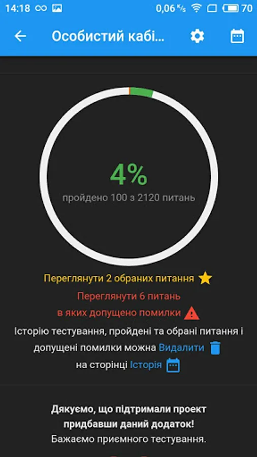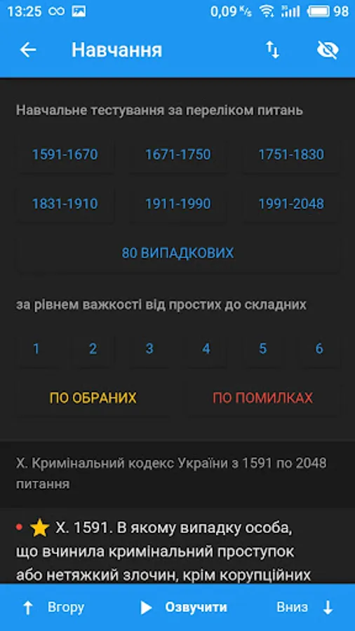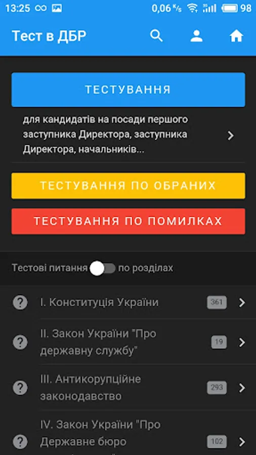 - Testing by questionx of any selected sections: in a row, randomly or by difficulty;