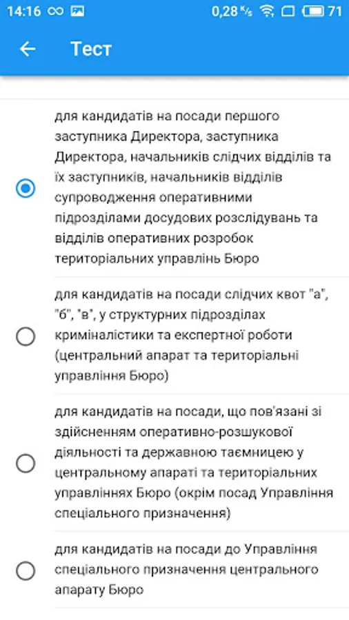 The qualification exam during the competition for appointment to positions in the central office of the State Bureau of Investigations and territorial offices of the State Bureau of Investigations involves testing to verify knowledge of the legislation.