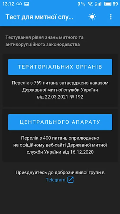 With the help of the proposed educational application, you have the opportunity to undergo trial testing and interactive training for the exam in order to identify the level of qualification of officials of the State Customs Service, who, in accordance with the resolution of the Cabinet of Ministers of Ukraine dated September 30, 2020 No. 895 "Some issues of territorial bodies of the State Customs Service" are reorganized by joining the State Customs Service: