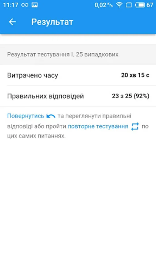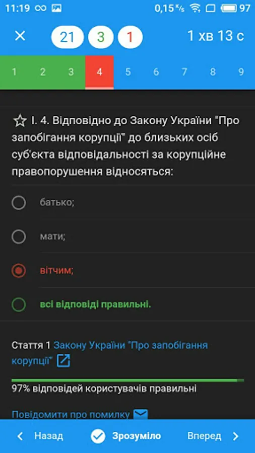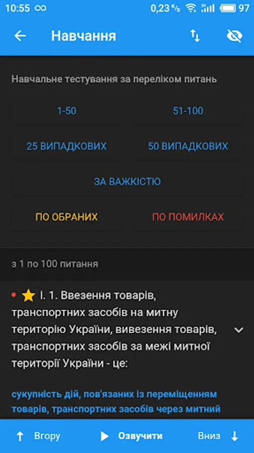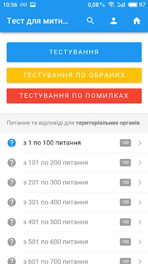 - Testing by questionx of any selected sections: in a row, randomly or by difficulty (determined by the statistics of passing tests by all users of the application);