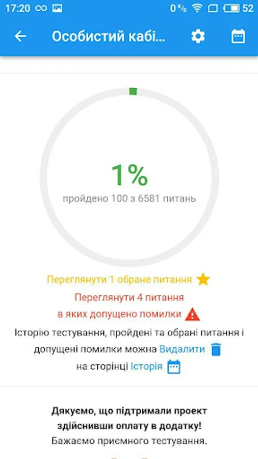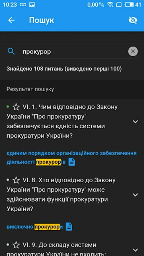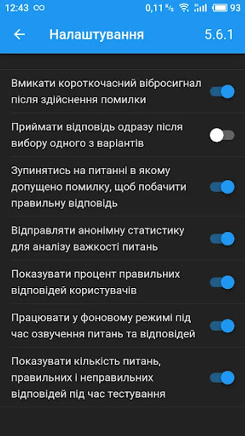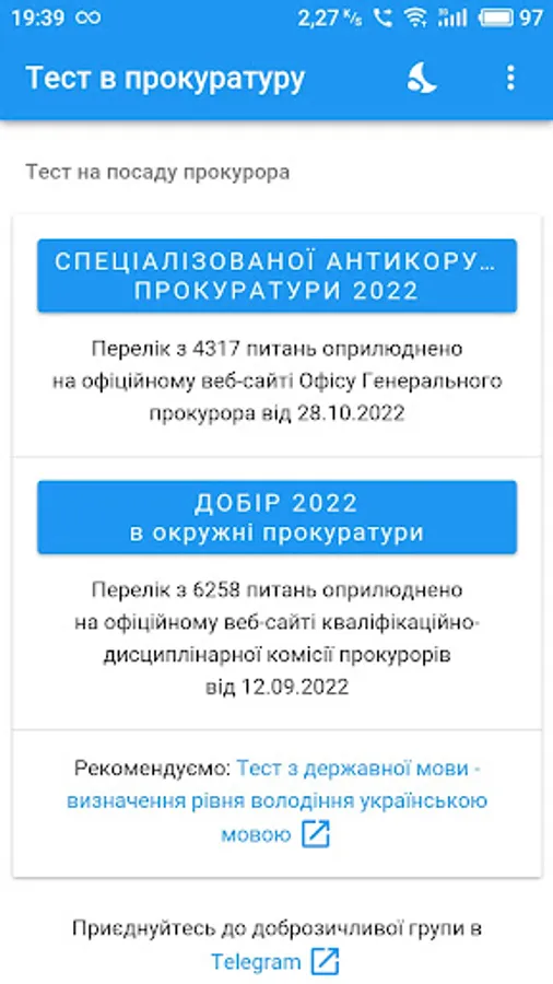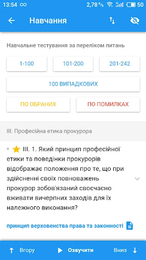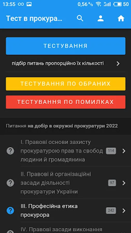 - Testing by questionx of any selected sections: in a row, randomly or by difficulty (determined by the statistics of passing tests by all users of the application);