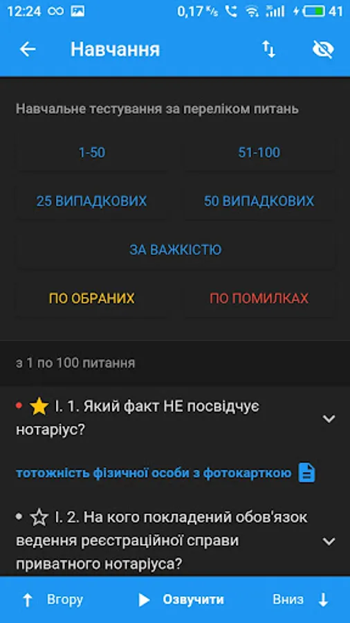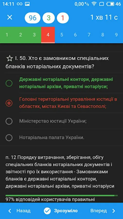 With the help of the proposed educational application, which contains a list of all test questions published on the website of the Ministry of Justice of Ukraine, you have the opportunity to take the trial test an unlimited number of times, which greatly facilitates and speeds up preparation.