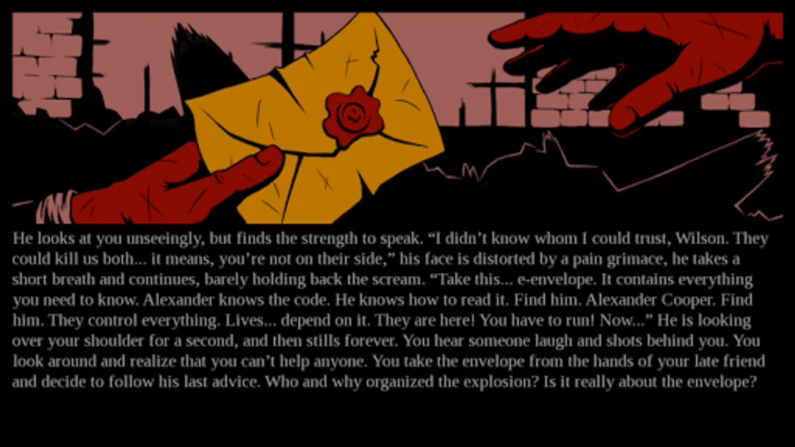 This is a story about the adventures of Wilson Smith in the huge industrial city of Staighrem. The main character gets into a dangerous and totally incomprehensible situation. A friend of Wilson died in an exploded pub and before his death had asked to find Alexander Cooper and give him a cyphered letter. After that criminals started to hunt for the hero and he decided to find Alexander and try to understand what’s going on?