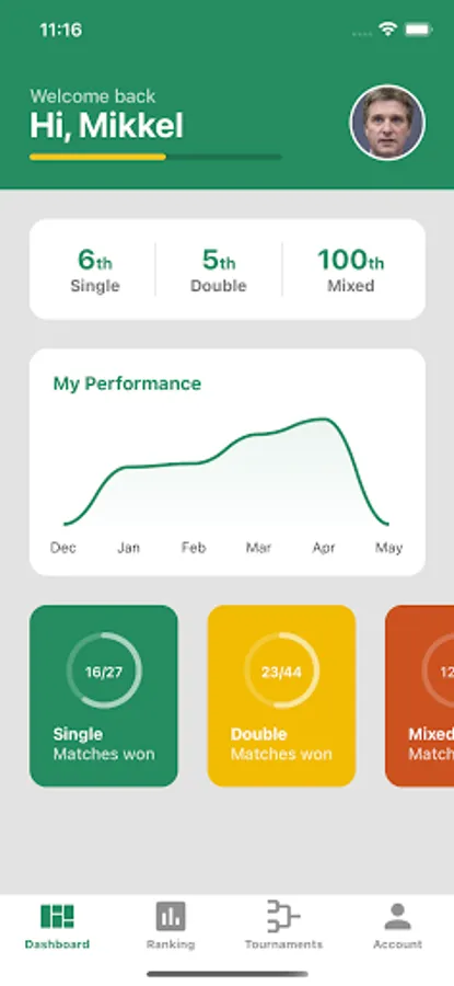 See how players perform in different categories Single, Double and Mix