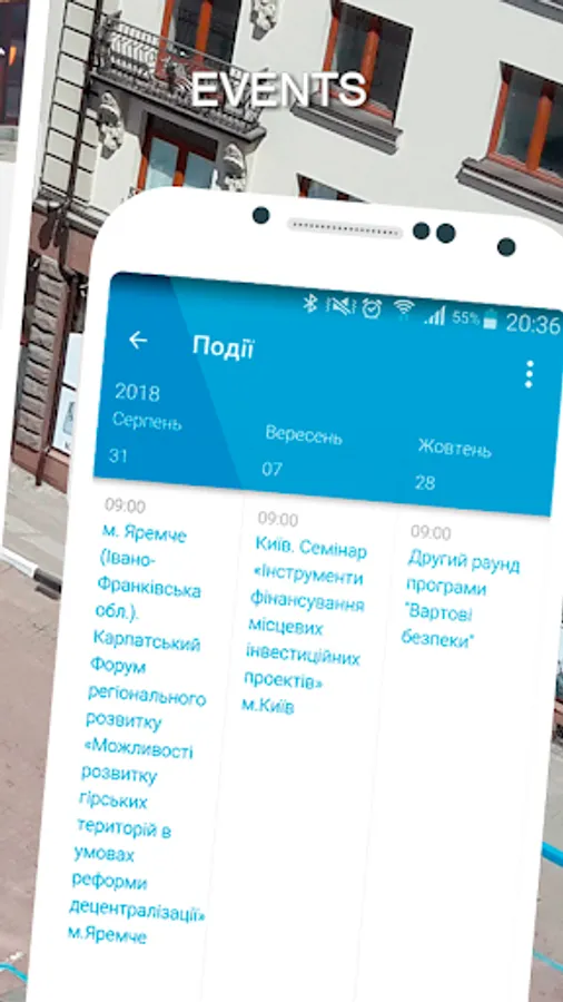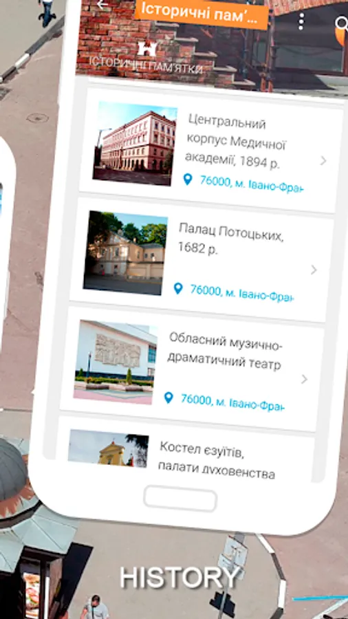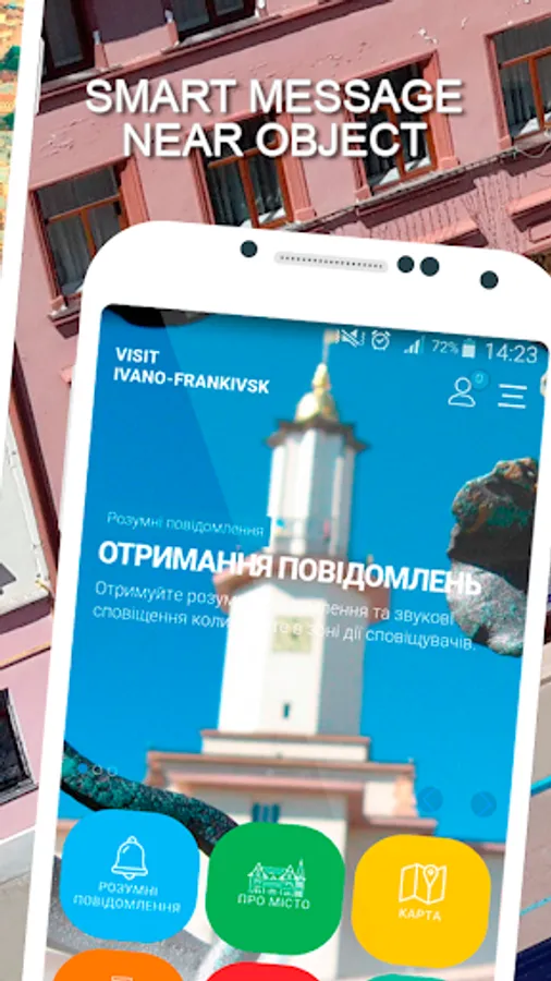 Using the program "Visit Ivano-Frankivsk" you will be able to receive intelligent messages from facilities equipped with transmitters. When you enter the transmitter's zone, you will automatically receive information about this object, its events and will be able to listen to the audio tour in the selected language.