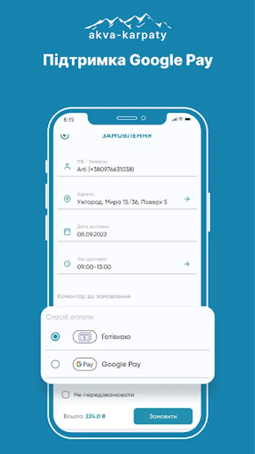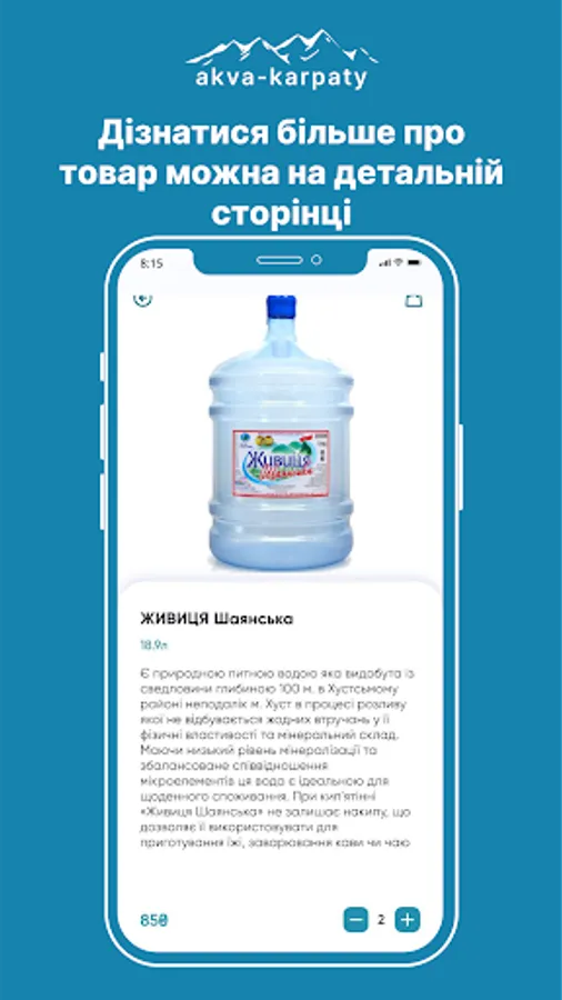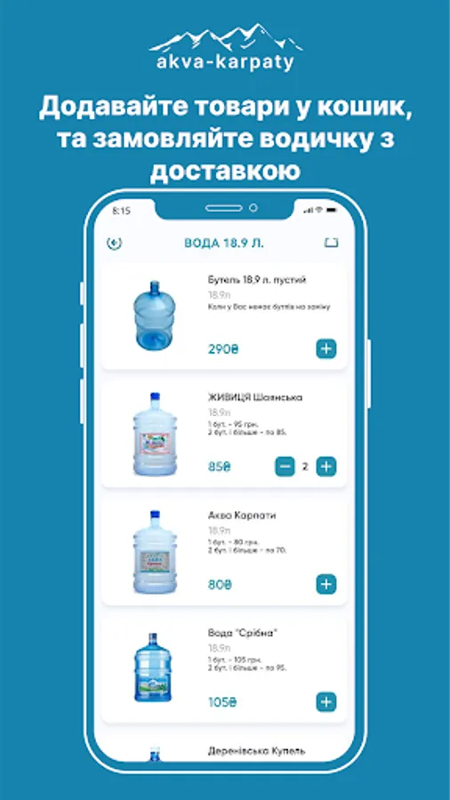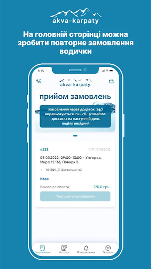 The Aqua Carpathians app allows you to view the product catalog, track promotions, place orders and receive notifications about order status.