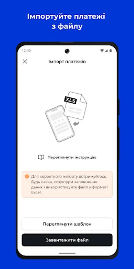 — Import of payments. Create a file with payments according to the template, upload it to the application and send it to the bank in a package.