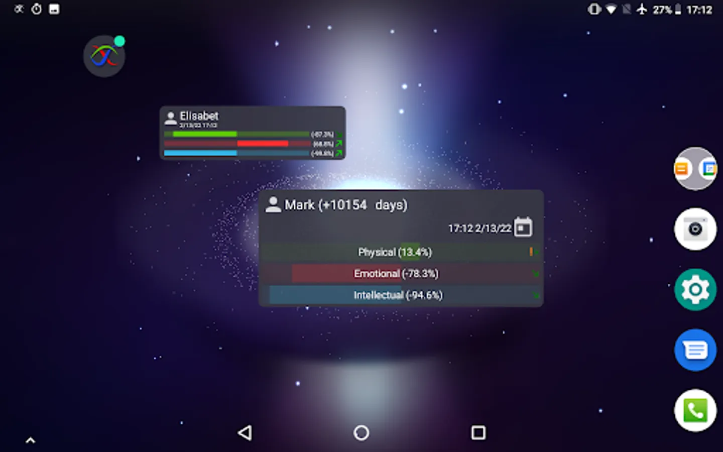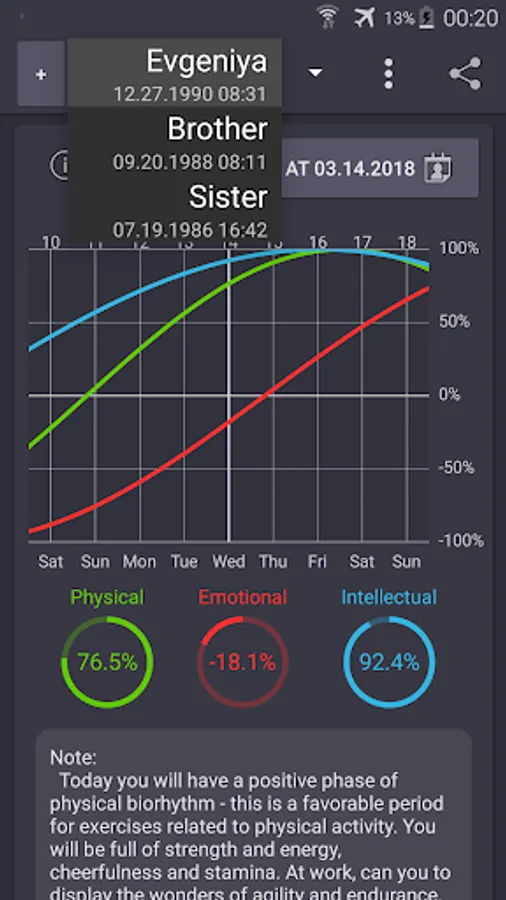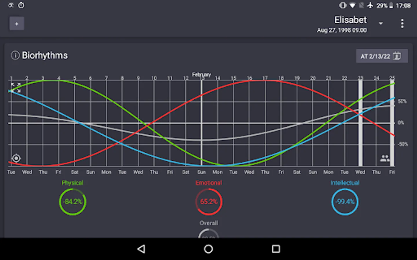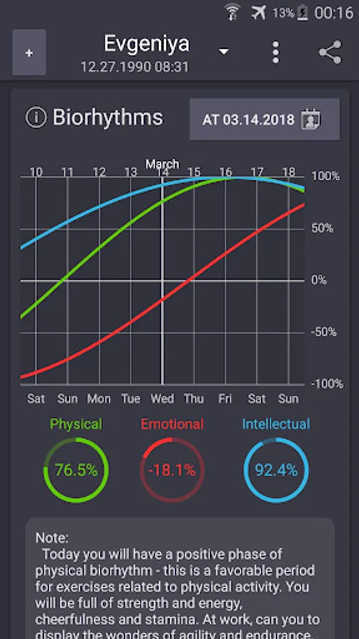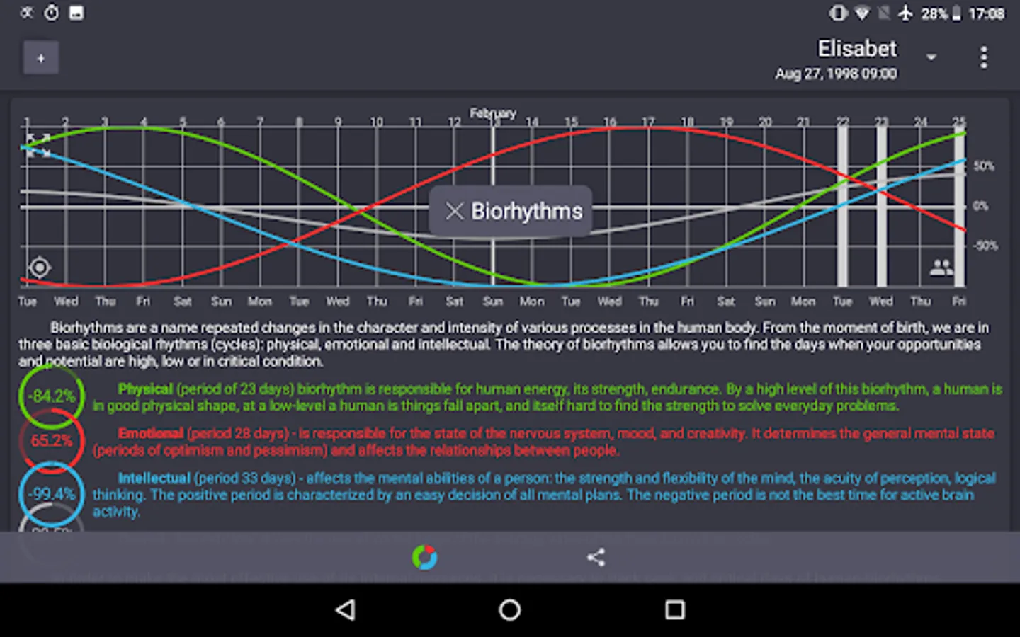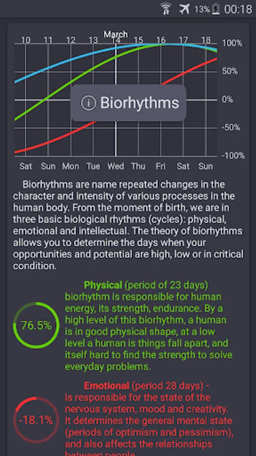 The application displays data on 3 biorhythms, since the person from the day of birth is in exactly these biological rhythms: