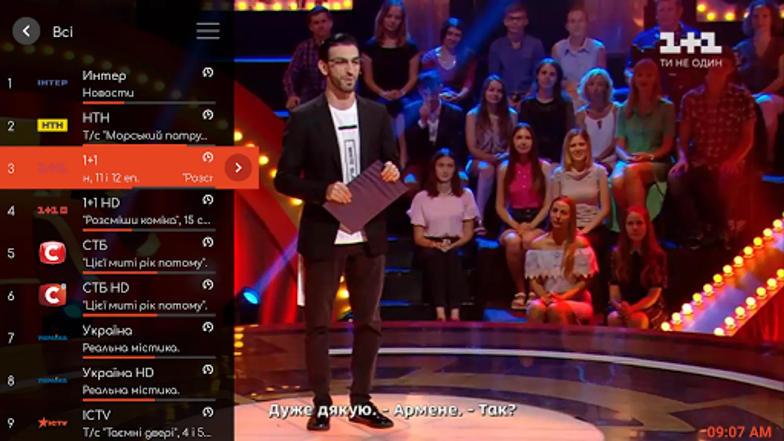 More than 180 best Ukrainian and international channels: STB, Inter, 1 + 1, ICTV, Novyj Kanal, Ukraine, Football 3 HD, Setanta Sports HD, VIP Premiere HD, VIP Megahit HD, TV 1000 Action, TV 1000 World cinema, and others .