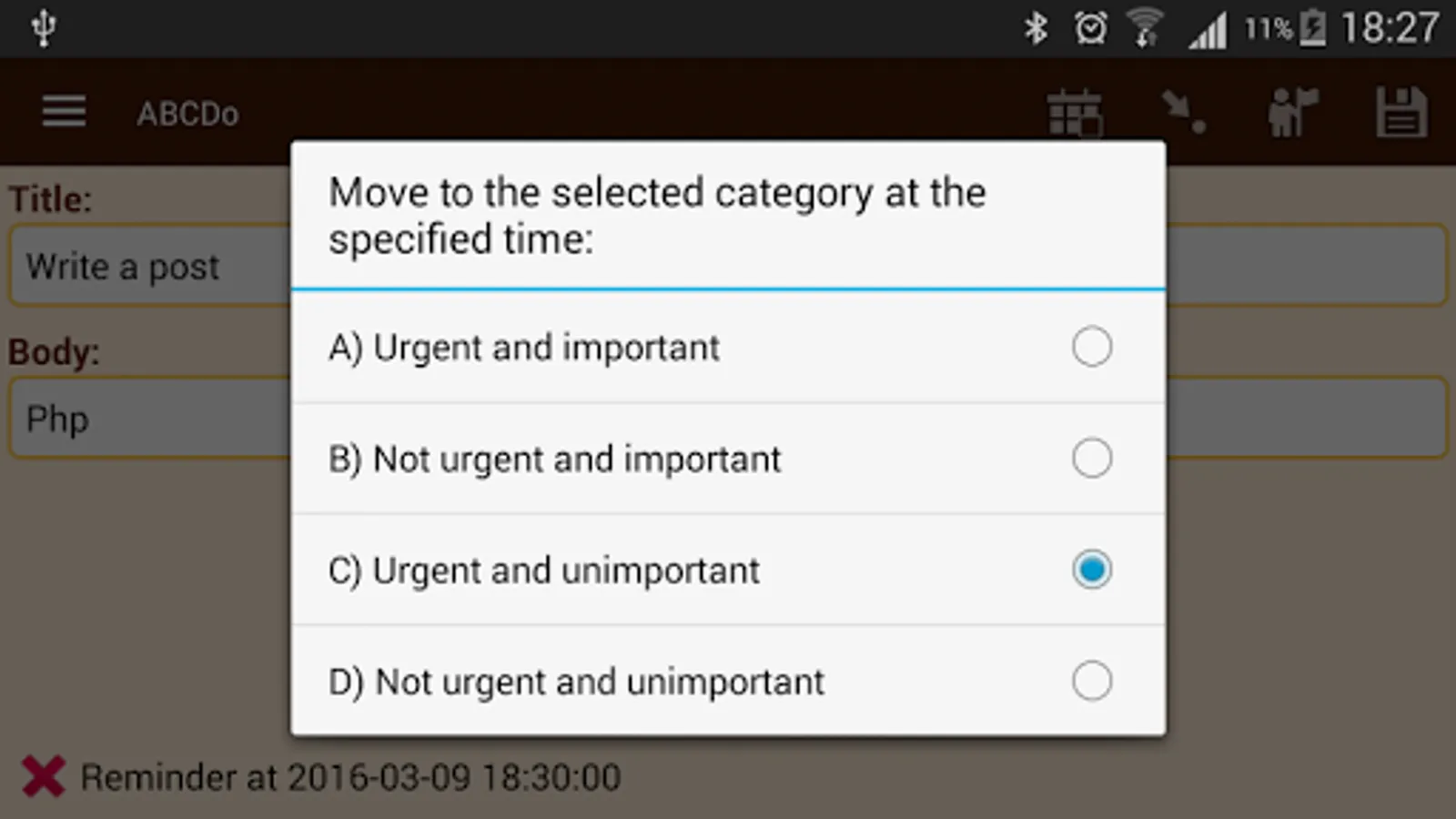For each task, you can set the reminder time or by geographic coordinates. Or move to a different category at a certain time, for example, when there is an urgent task becomes urgent.
